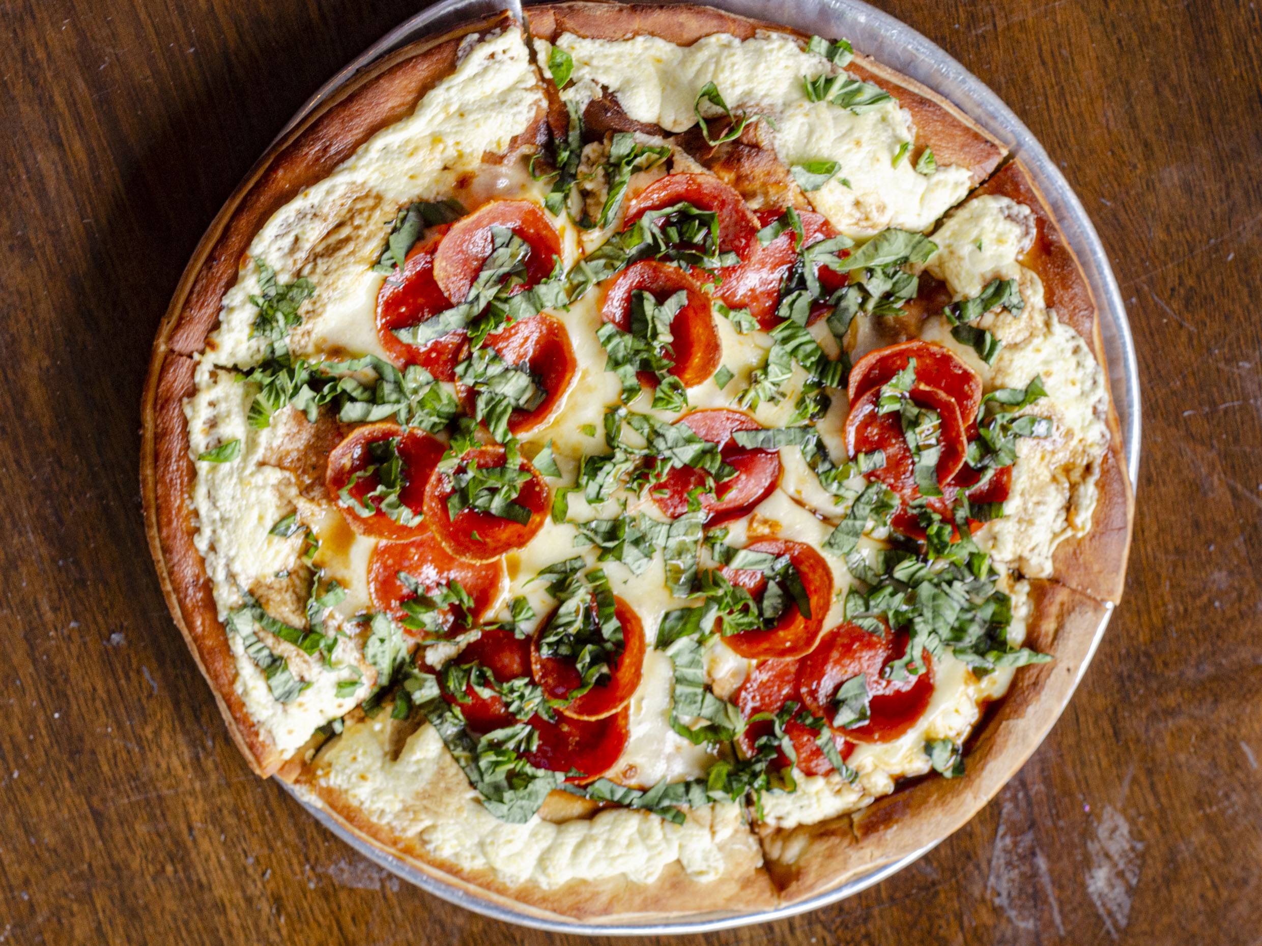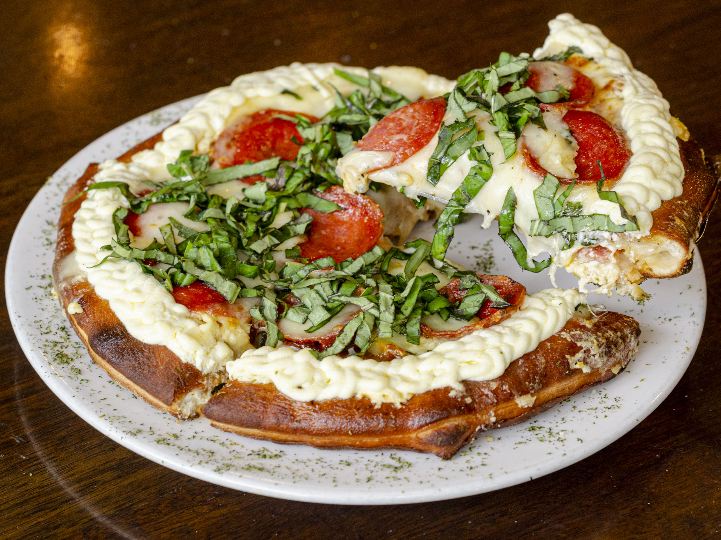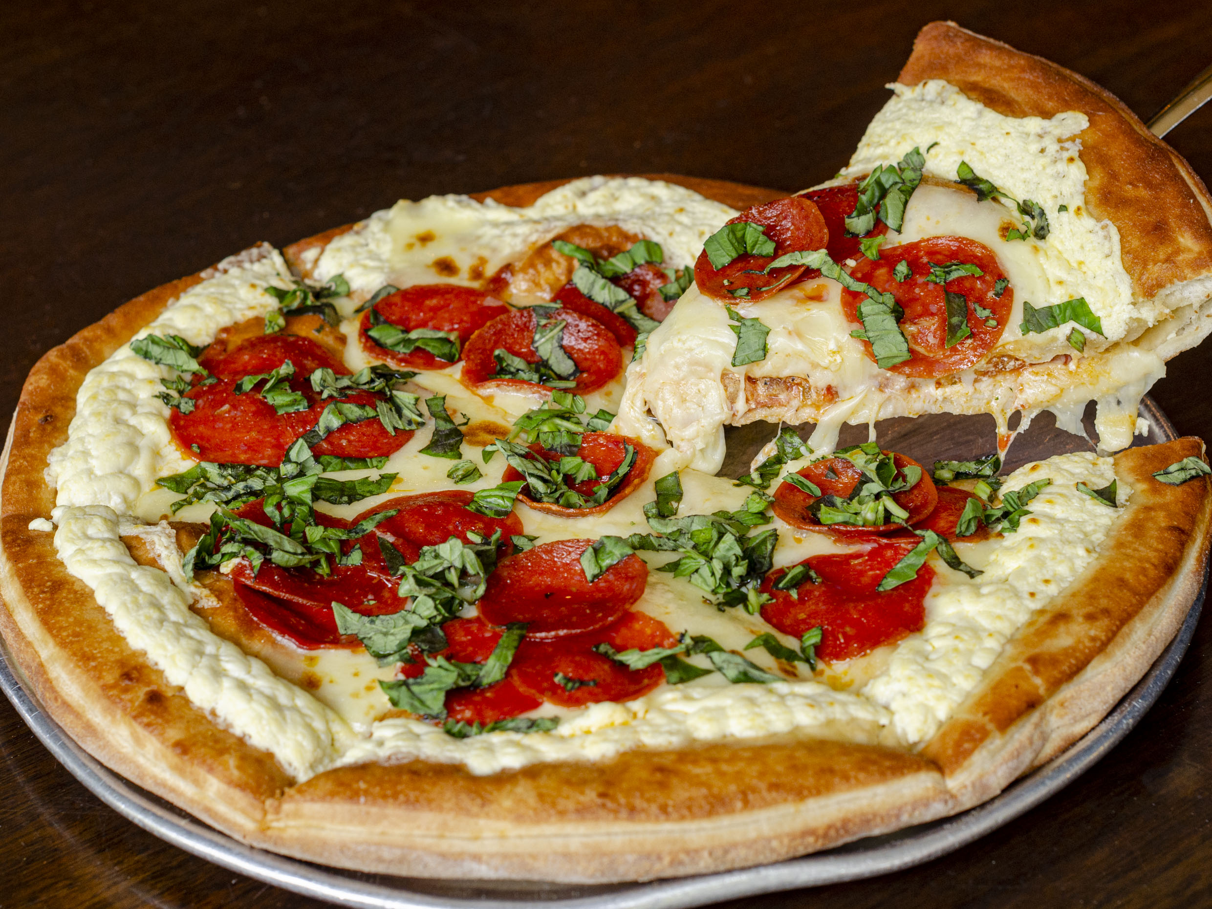 Pizza con masa delgada de 31 cm con 6 porciones de Mozzarella, Pepperoni, Reducción de Balsámico y Toques de Queso Crema y Base de Pesto.
