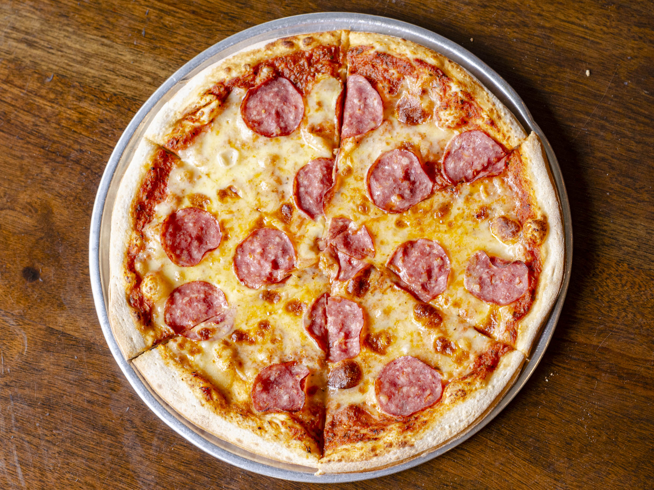Pizza con masa delgada de 31 cm con 6 porciones de Queso Mozzarela, Salami y Base Napolitana de Tomate Orgánico San Marsano.