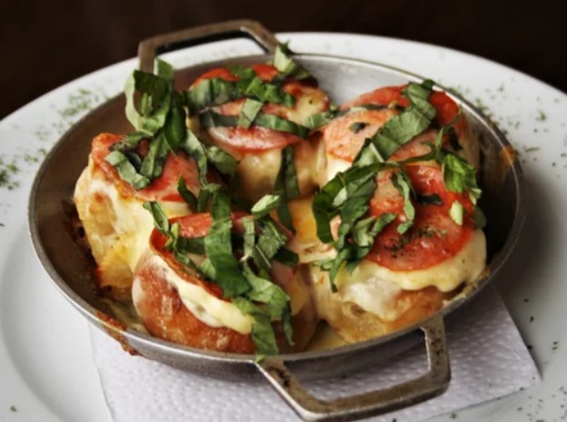 Panes gratinados con pepperoni, queso crema, mozzarella y albahaca.