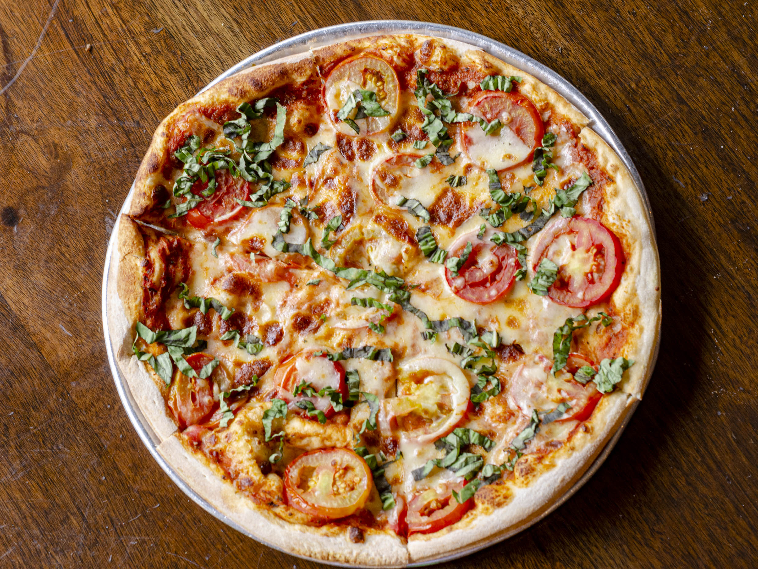 Pizza con masa delgada de 31 cm con 6 porciones de Queso Mozzarela, Tomate San Marsano, albahaca y Base Napolitana de Tomate Órganico San Marsano