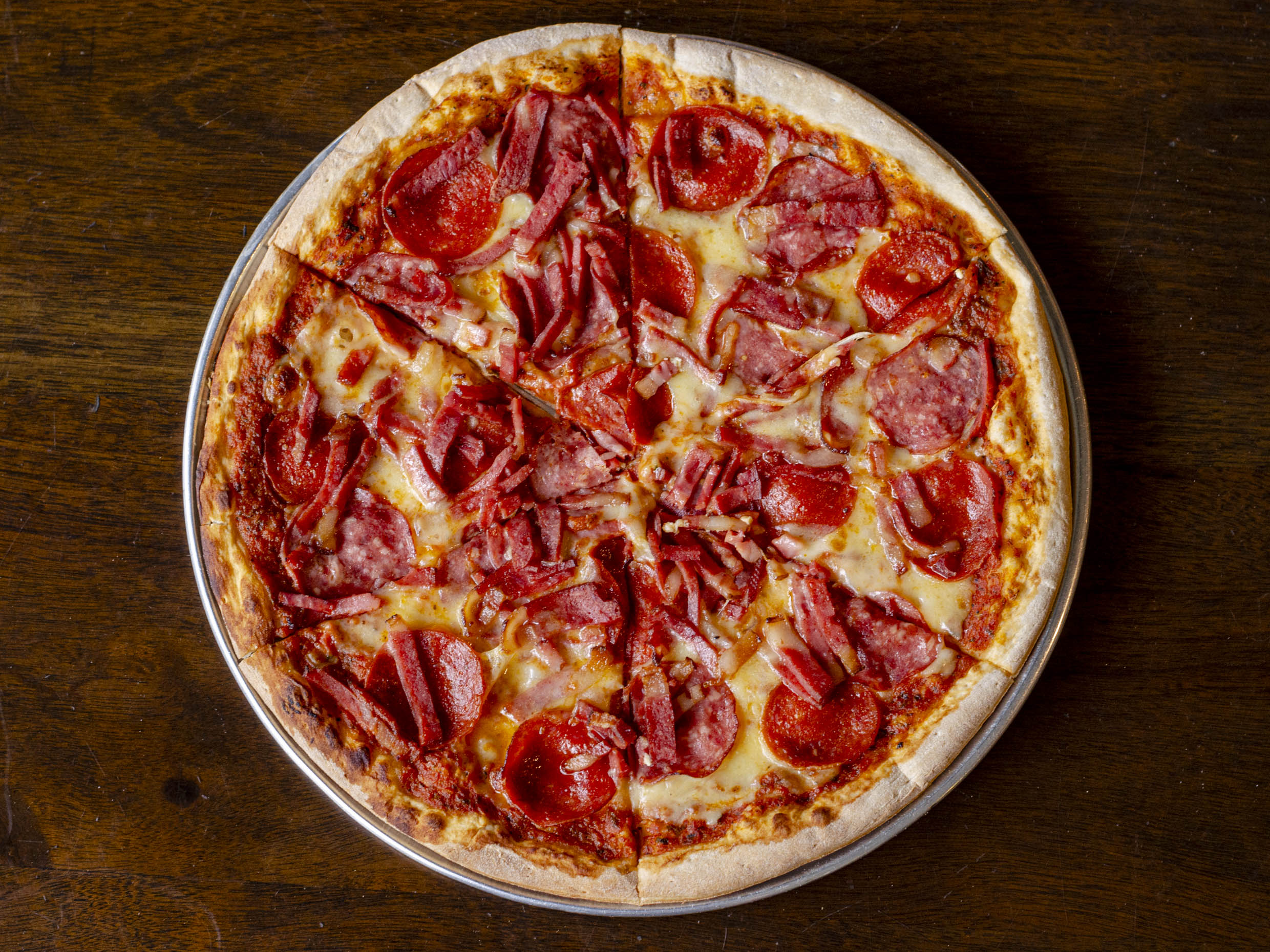 Pizza estofada de 31 cm con 6 porciones de Jamón Cábano, Salami, Queso Mozzarella, Queso Crema, Tocineta Ahumada y base Napolitana de Tomate Orgánico San Marsano.
