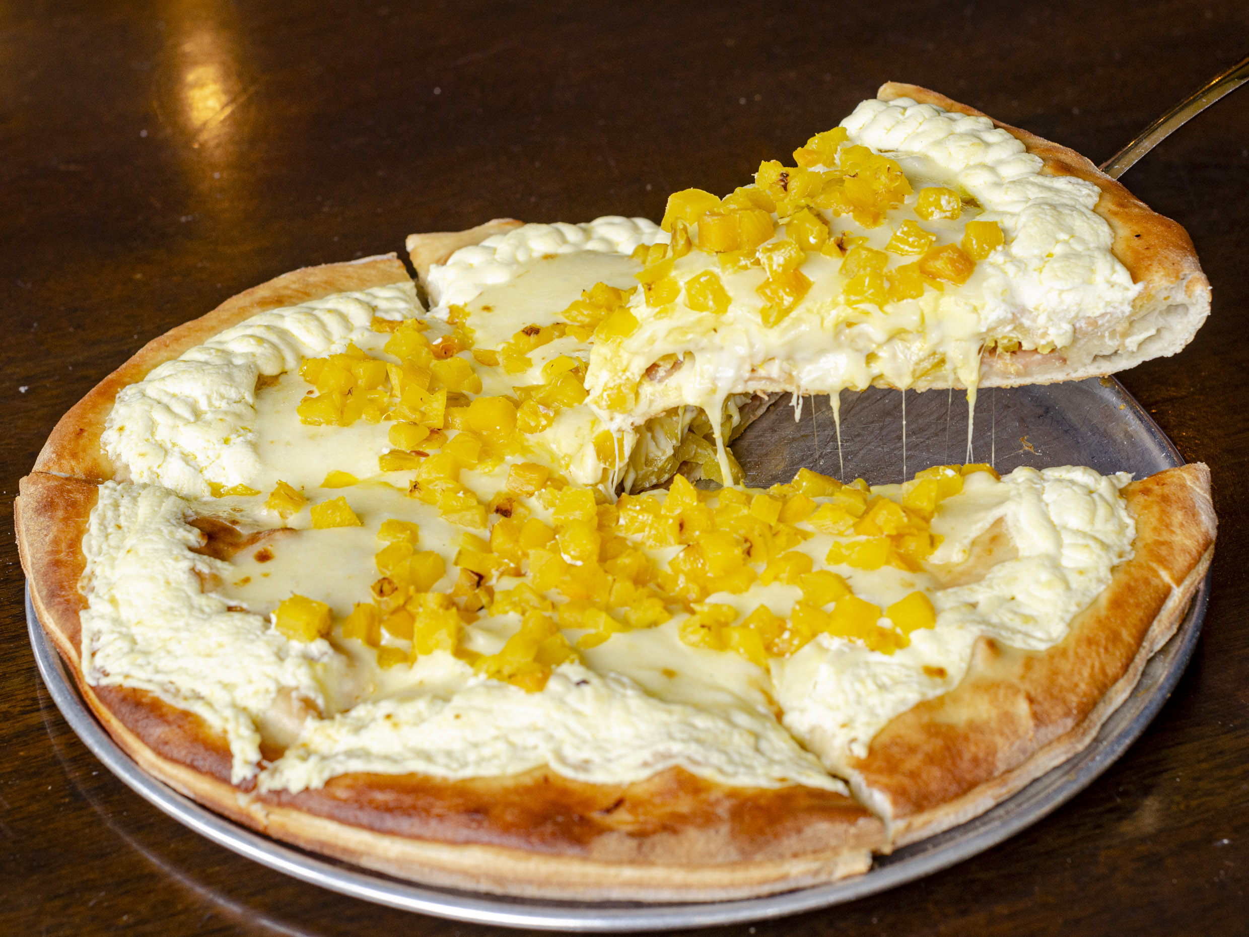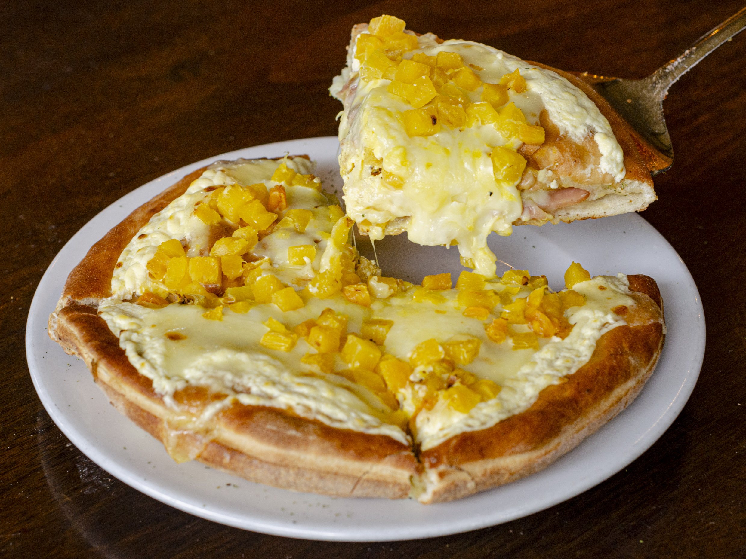 Pizza estofada de 31 cm con 6 porciones de Piña, Jamón, Gratinada con extra queso, Queso crema y base de Salsa de la Casa.
