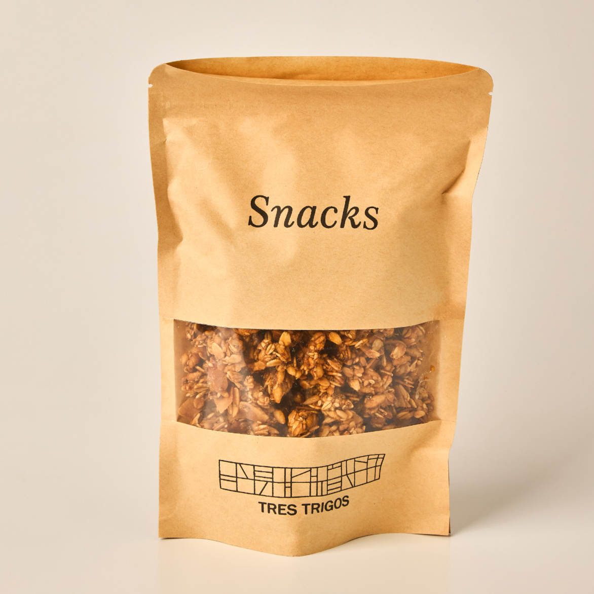 Granola elaborada artesanalmente con avena, arroz, coco, almendras y semillas, endulzada con mango y panela.