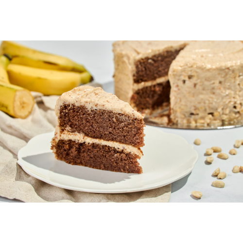 Torta de banano de dos capas, rellana con crema de mantequilla de maní.