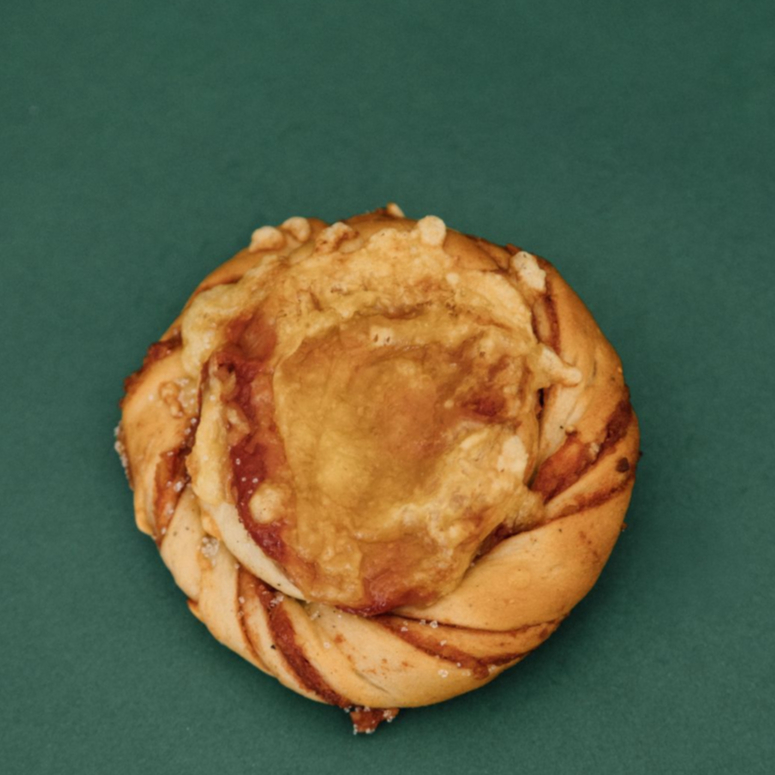 Producto elaborado a partir de mantequilla 100% natural, relleno de tocineta y queso mozzarella, finalizado con miga de centeno.
