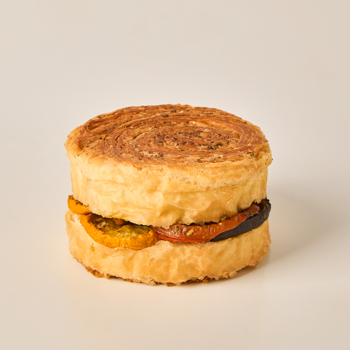 pan salado elaborado con harina de trigo y de algarrobo relleno con muffaletta de salami, pepperoni, queso provolone, tapenade de aceitunas y pimentón asado