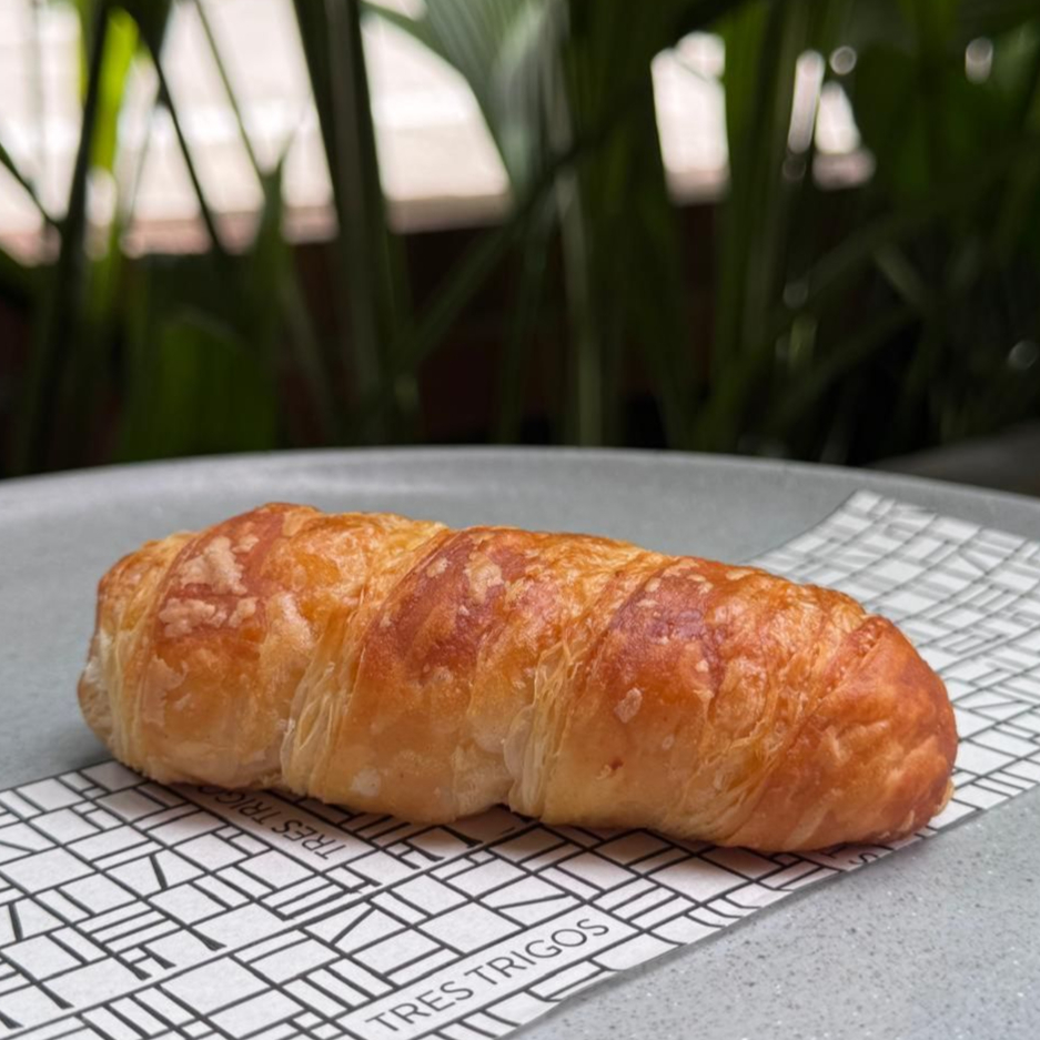 Elaborado a partir de mantequilla 100 % natural, relleno de crema pastelera de almendras, finalizado con almendras en láminas y azúcar en polvo.