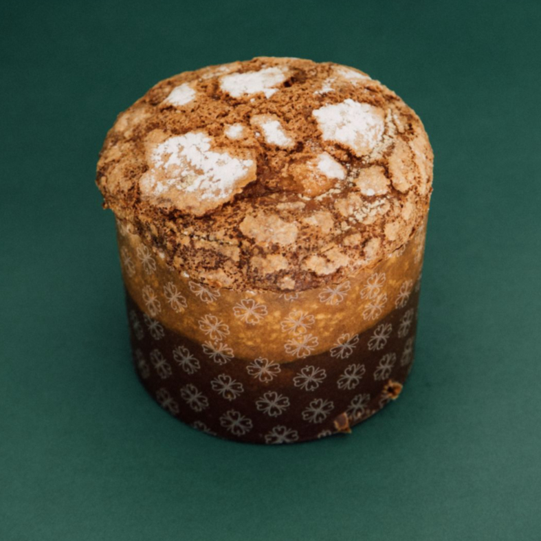 Panettone tradicional, sabor chocolate, masa elaborada con ganache de chocolate al 70 y relleno con chunks de chocolate al 47