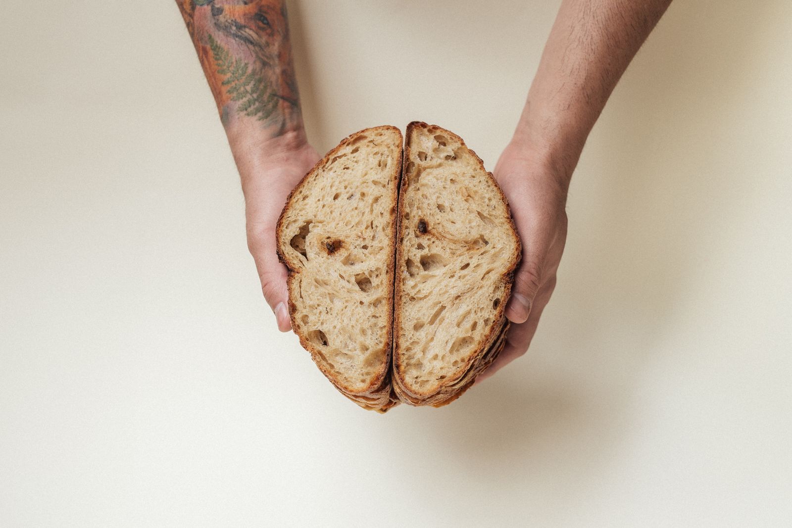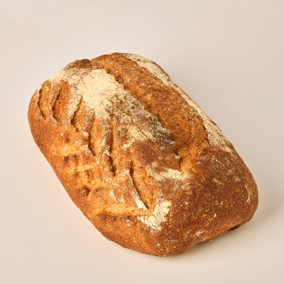 Pan rústico, elaborado con harina de trigo y harina de trigo integral, fermentado con masa madre, libre de huevos y lácteos, vegano.