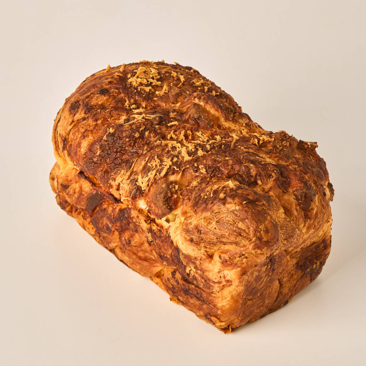 Pan de molde trenzado, fermentado con masa madre, relleno de queso campesino y queso parmesano en la superficie.