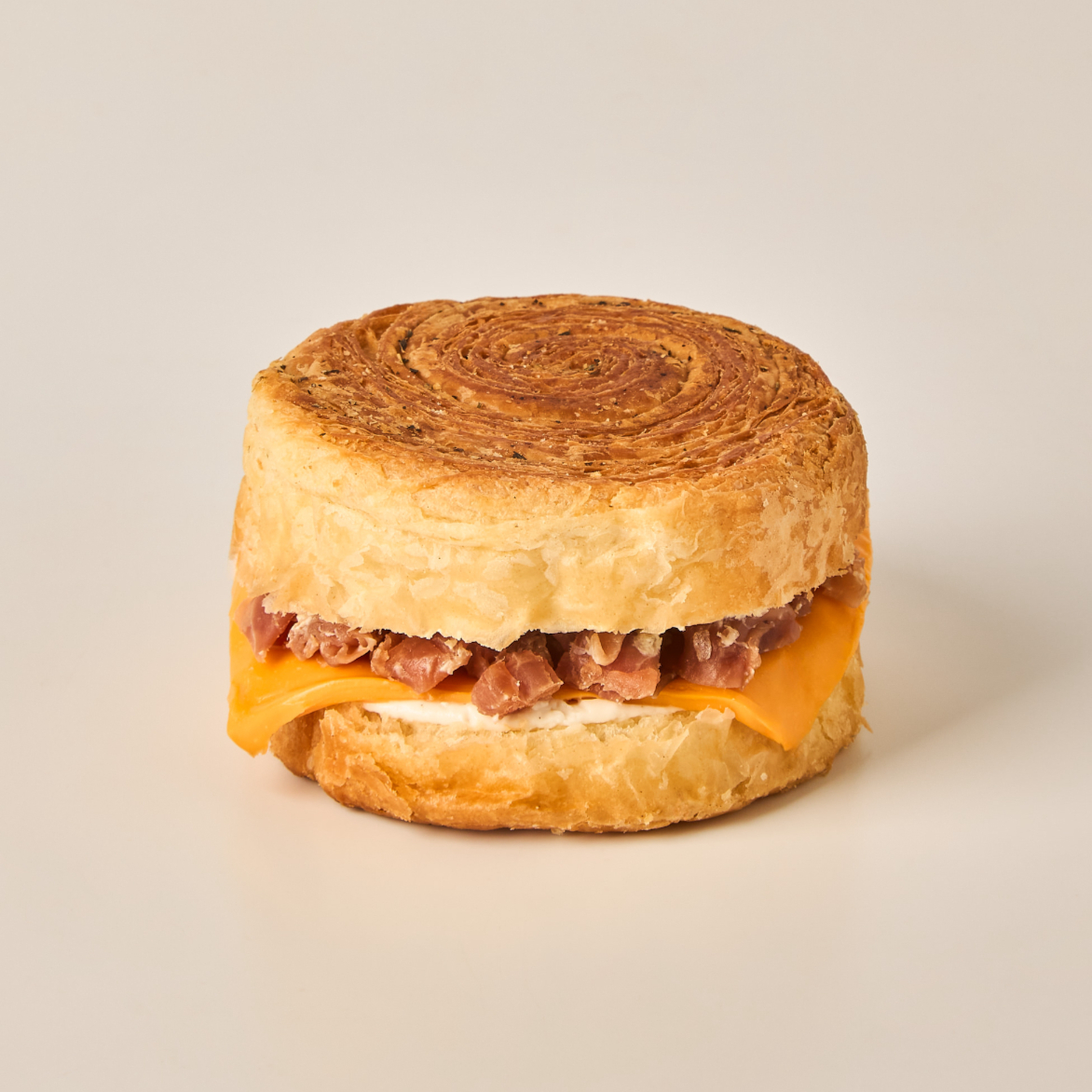 Producto elaborado a partir de mantequilla 100% natural, relleno de tocineta y queso mozzarella, finalizado con miga de centeno.