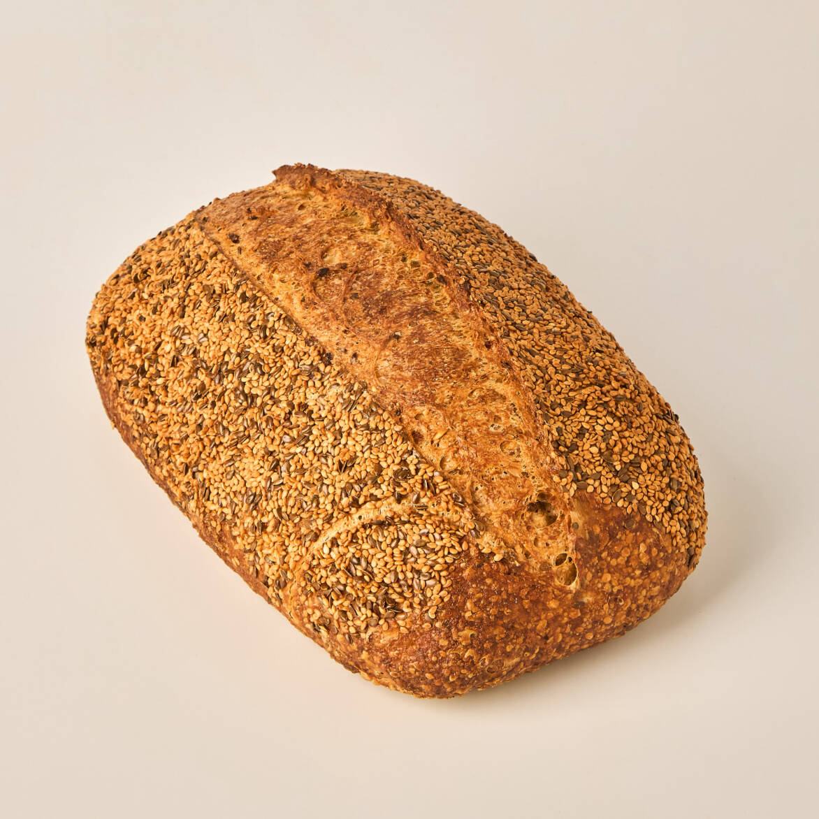 Pan rústico hecho con masa madre, harina de trigo, avena en hojuelas, linaza, ajonjolí, salvado de trigo, arroz integral cocido, sal y agua, vegano.