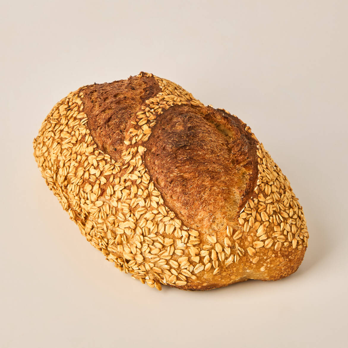 Pan rústico fermentado de manera natural con masa madre elaborado con avena, arroz integral y panela, libre de huevos y lácteos, vegano.