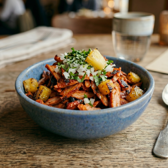 Carne al pastor de 200 gr con trozos de piña y cilantro fresco.