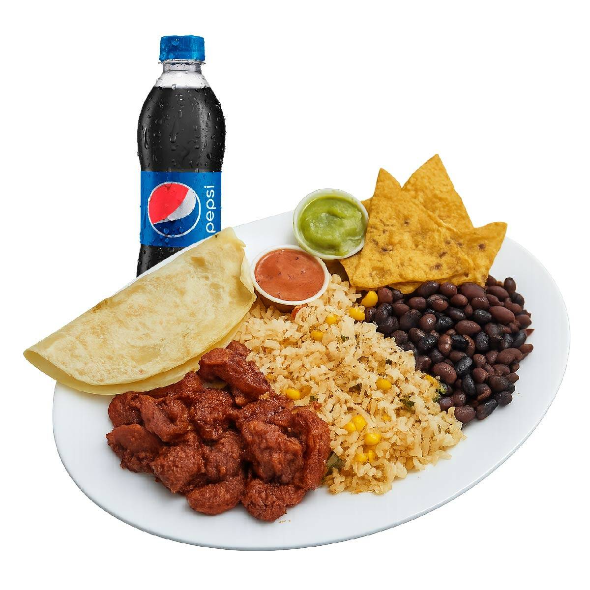 Arroz mexicano, frijol, 1 mini quesadilla, sour cream , maduros, nachos, carne al pastor y picantes al gusto.
