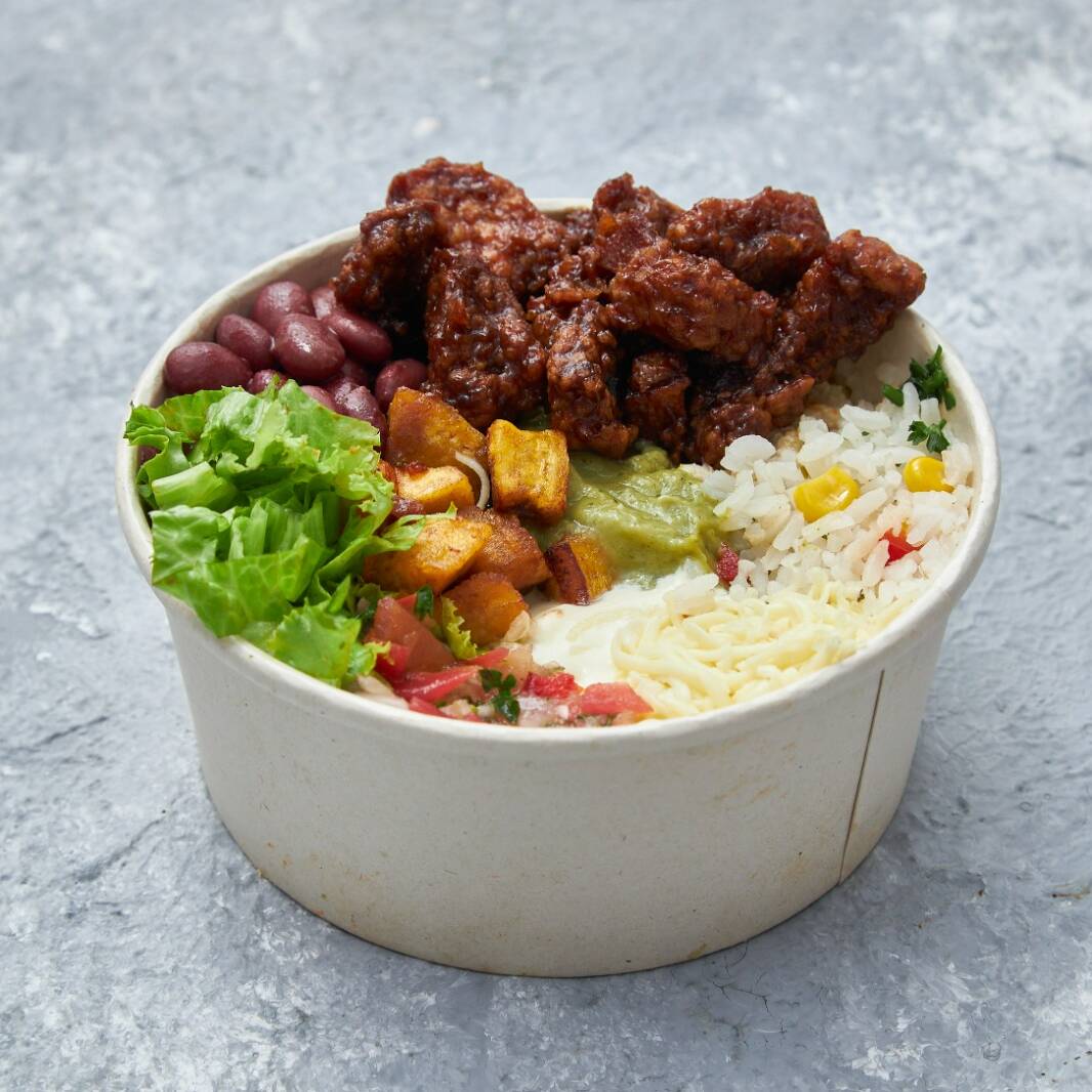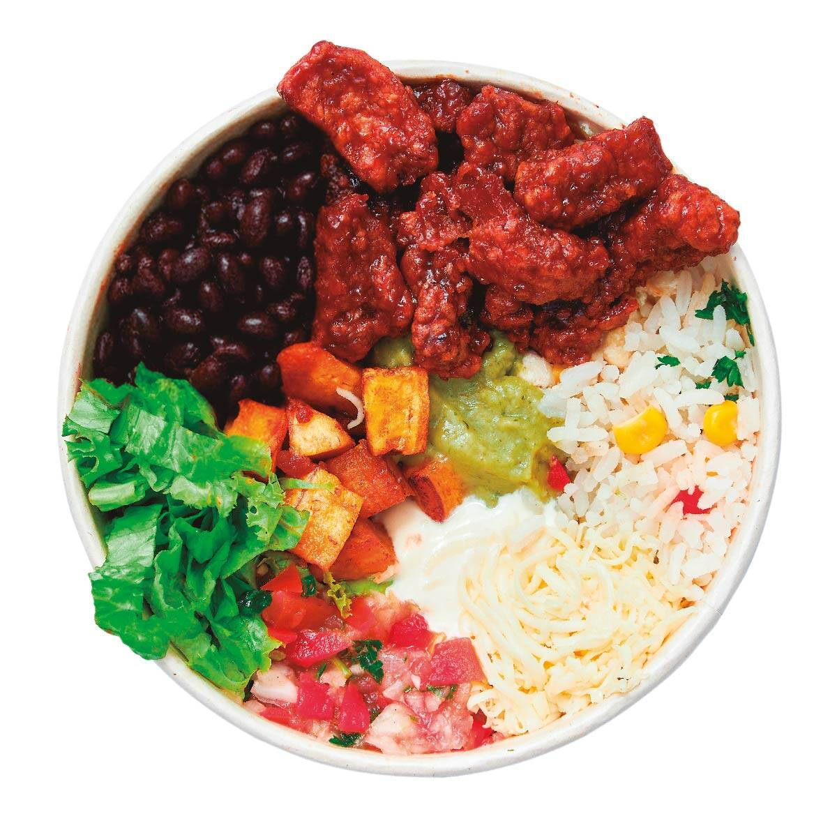Arma tu bowl mediano con una proteína, bases como frijol o arroz, 5 toppings, salsas y piques. Personaliza sin repetir ingredientes.