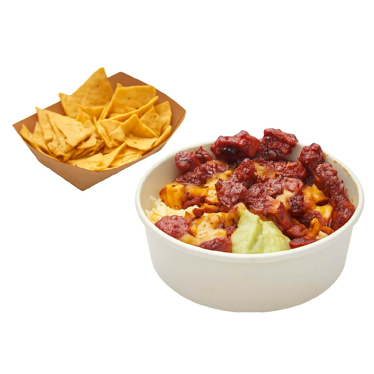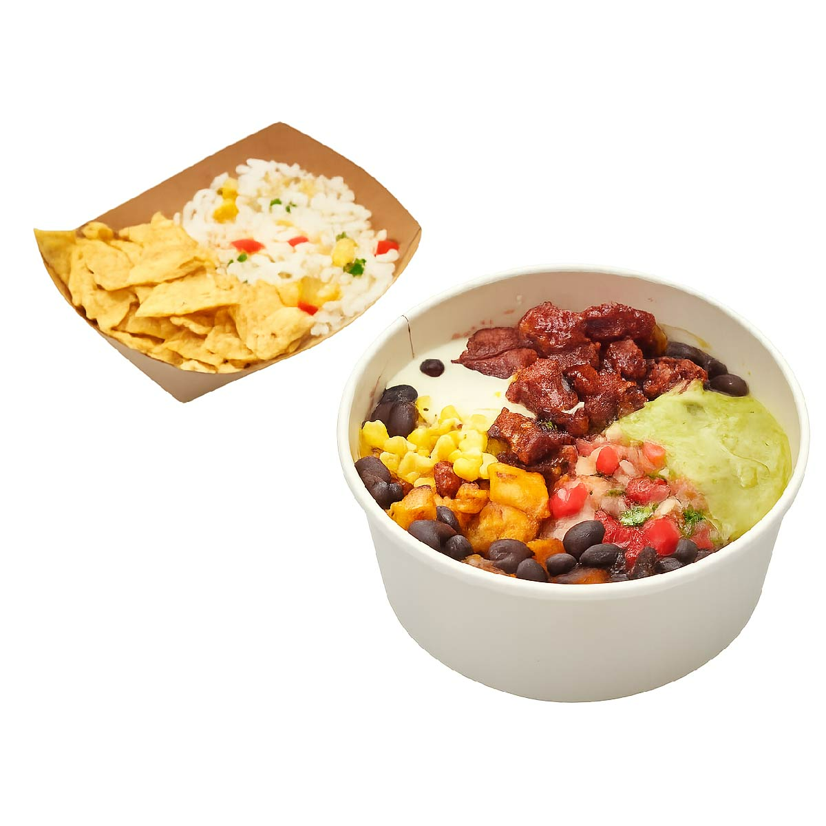 Bowl de frijoles, chicharrón, guacamole, maduro, pico de gallo, sour cream, arroz a elección, nachos y picantes al gusto.