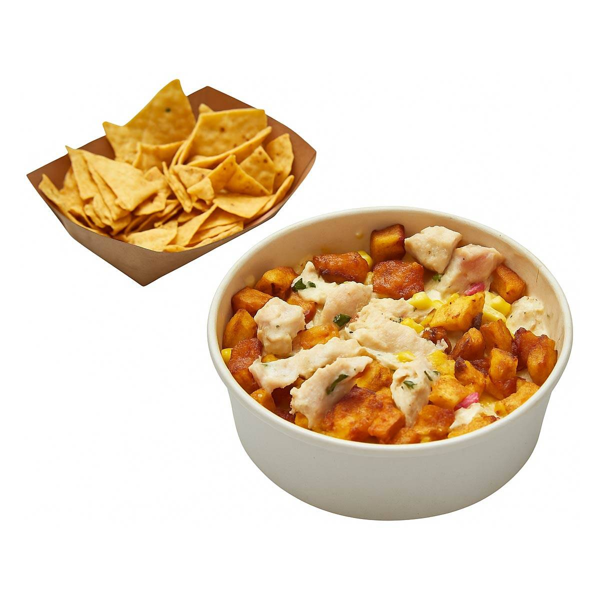 Bowl de maíz con pollo, sour cream, queso, maduro y nachos. Picantes al gusto.