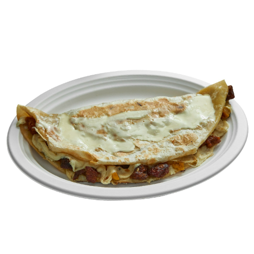 Tortilla grande, queso, maíz tierno, maduro, sour cream, proteína a elección y picantes al gusto.