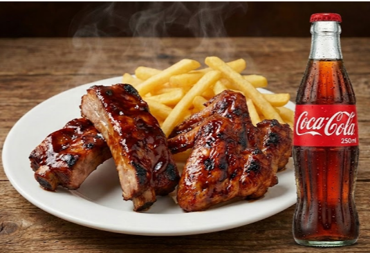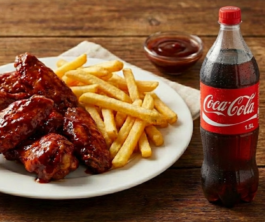 2 Alitas BBQ más 2 costilla porción de papas a la francesa más gaseosa de 250 ml.