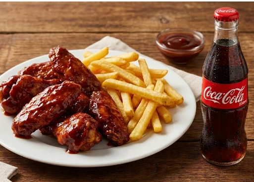 4 Alitas BBQ más porción de papas a la francesa más gaseosa de 250 ml.