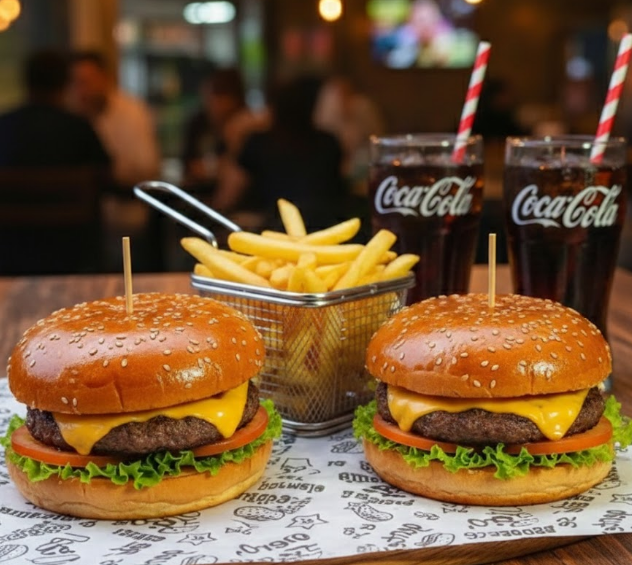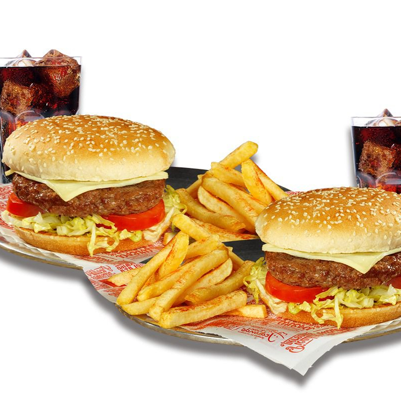 2 Hamburguesas clásicas con lechuga y tomate con 2 porciones de papas a la francesa y 2 Gaseosas de 250 ml.