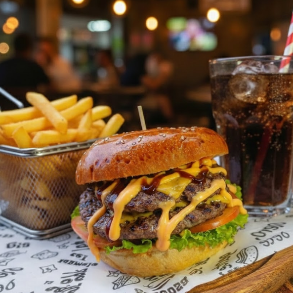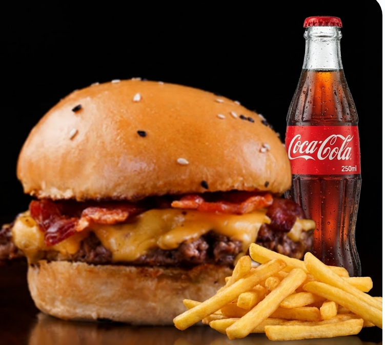 Pan artesanal, deliciosa carne artesanal de res, queso cheddar, tocineta bañada a la BBQ, vegetales frescos, lechuga crespa, tomate y salsa de la casa más porción de papas a la francesa más gaseosa de 250 ml.