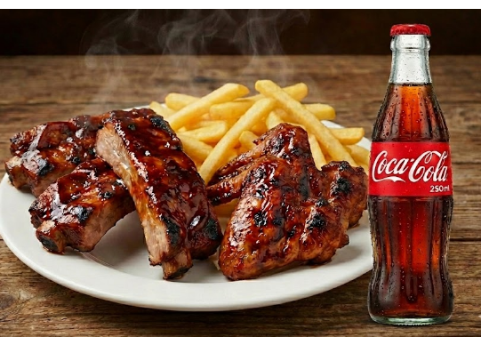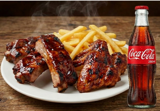 5 Alitas y 5 costilla BBQ más porción de papas a la francesa más 2 Gaseosas de 250 ml.