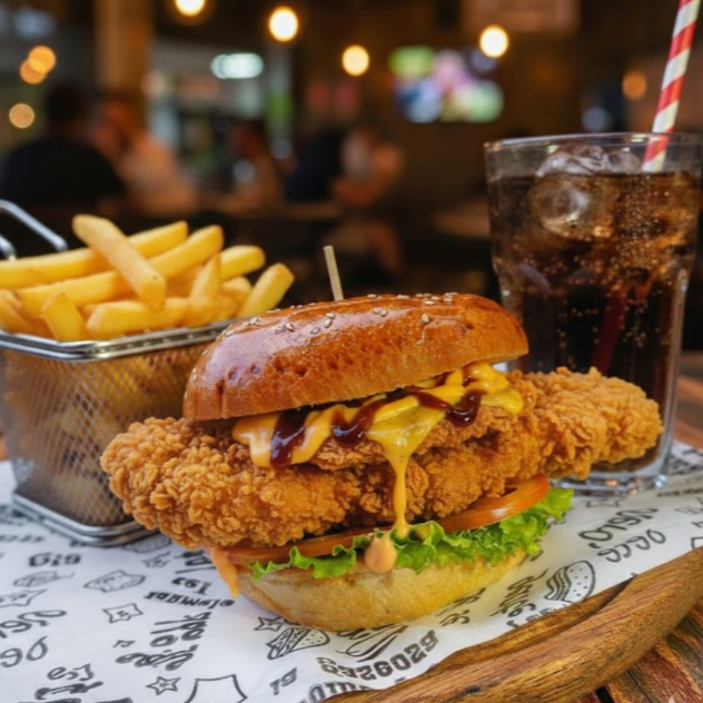 Pan artesanal, filete de pollo bañado en salsa chimichurri, queso cheddar, tocineta, lechuga crespa, tomate, cebolla caramelizada y salsas de la casa más porción de papas más gaseosa de 250 ml.