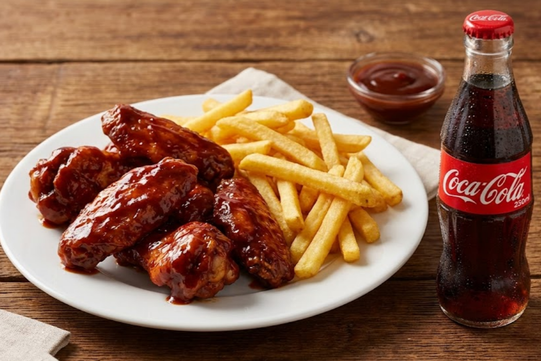 6 Alitas BBQ más porción de papas a la francesa más gaseosa de 250 ml.