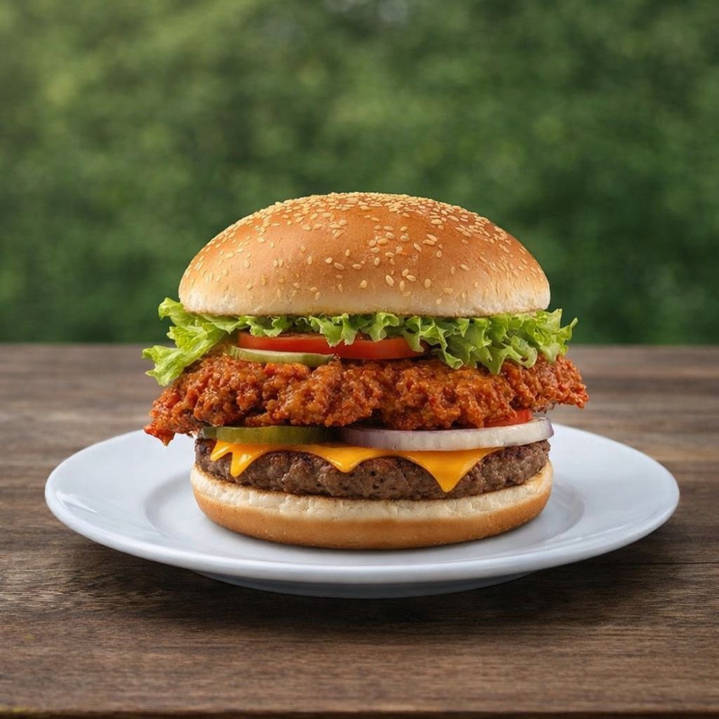 Pan artesanal, deliciosa carne artesanal de res, filete de pollo, queso cheddar, tocineta, maicitos, vegetales frescos, lechuga crespa, tomate, cebolla caramelizada y salsa de la casa.