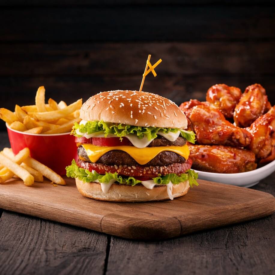 Pan artesanal, deliciosa carne artesanal de res, queso cheddar, vegetales frescos, lechuga crespa, tomate y salsa de la casa, 2 alitas, papas a la francesa, y gaseosa