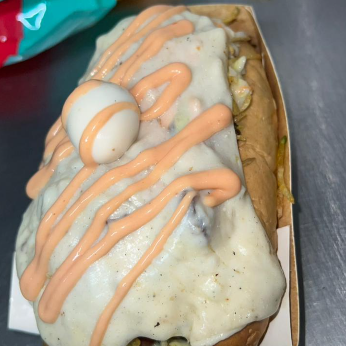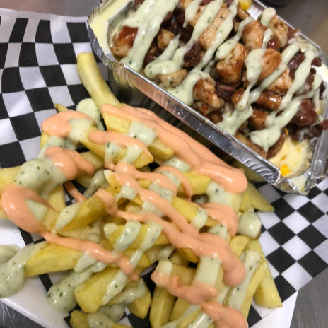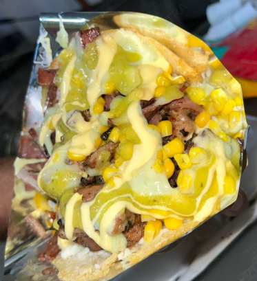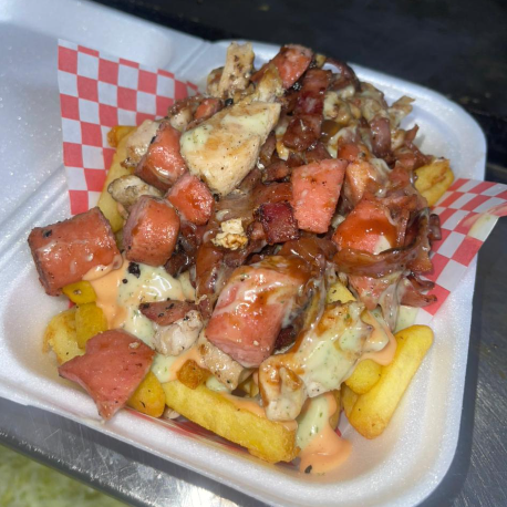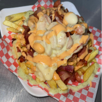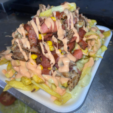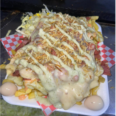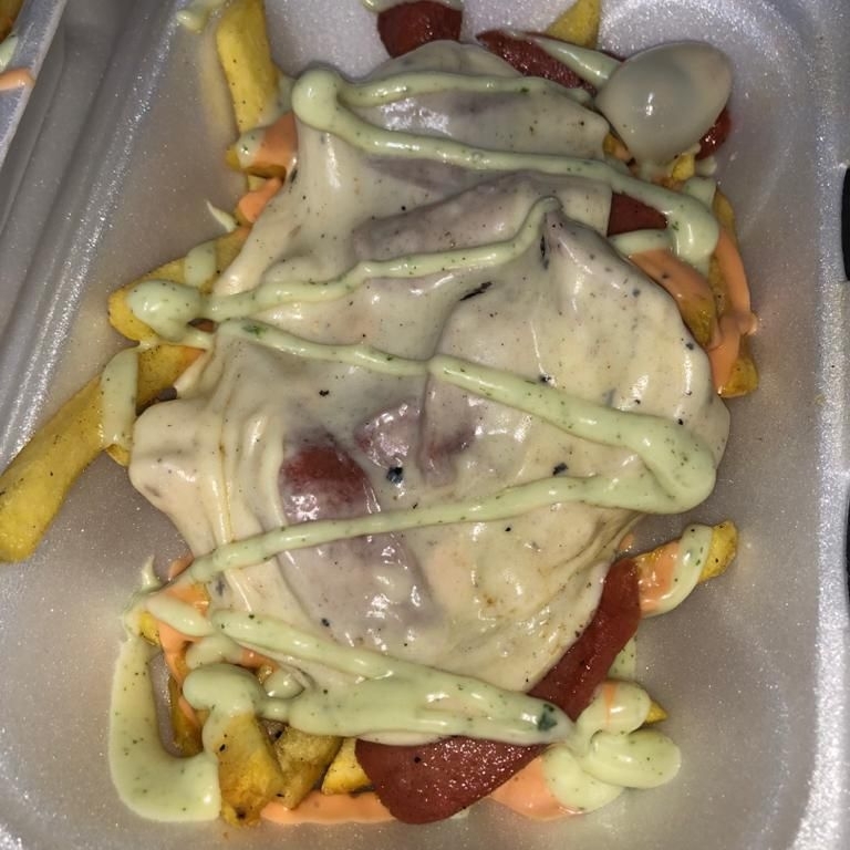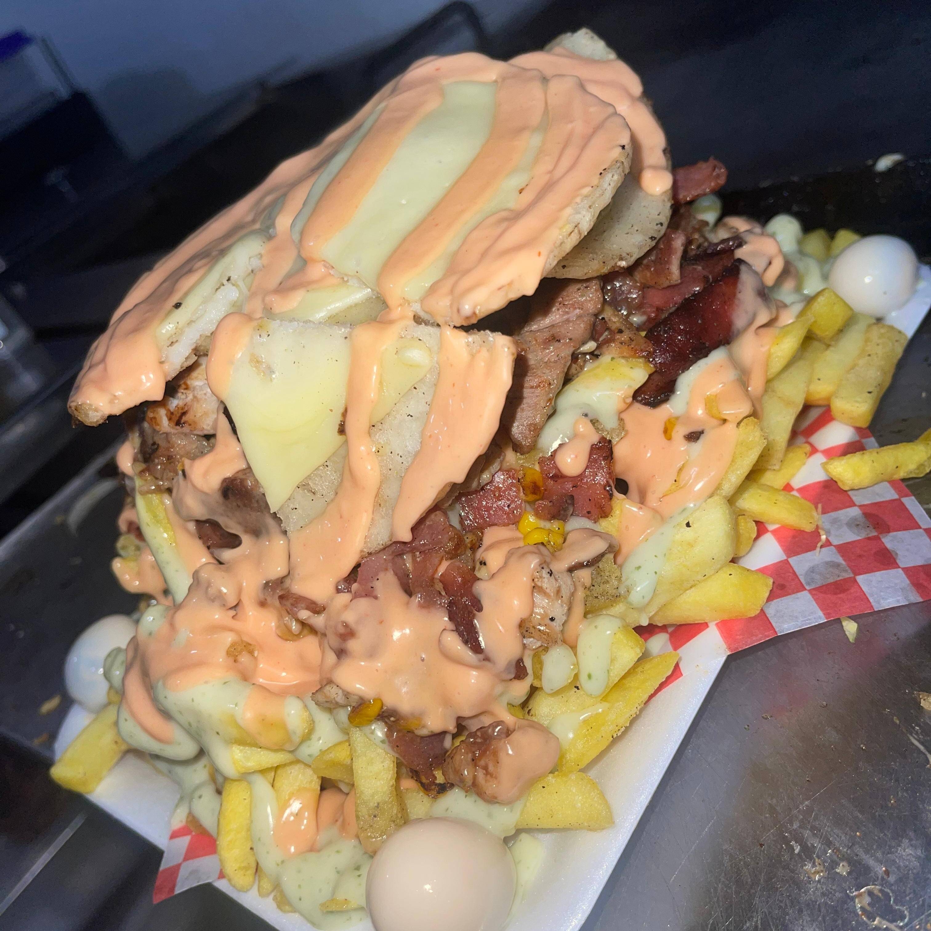 Papas a la francesa, salchicha, pollo, mucha tocineta, doble queso, huevo de codorniz, salsas.