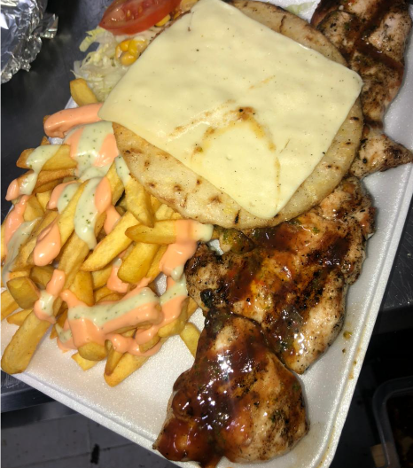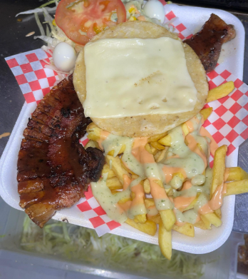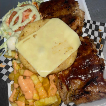 Papas a la francesa, ensalada de lechuga y maíz tierno, carne, pollo, salchicha, tocineta, huevo de codorniz, 2 arepas con queso, salsas.