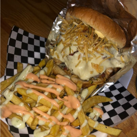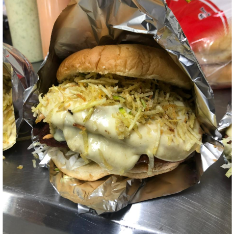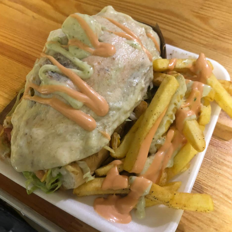 Pan, mucho pollo, doble queso, mucha tocineta, lechuga, tomate, cebolla caramelizada, ripio de papas, salsas, porción de papas a la francesa y huevo de codorniz.
