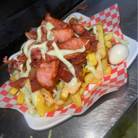 Papas a la francesa, mucha tocineta, salchicha, doble queso, huevo de codorniz, salsas.