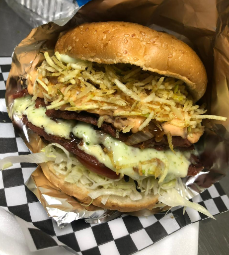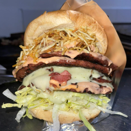 Pan, dos carnes, doble queso, mucha tocineta, lechuga, tomate, cebolla caramelizada, ripio de papas, salsas, porción de papas a la francesa y huevo de codorniz.