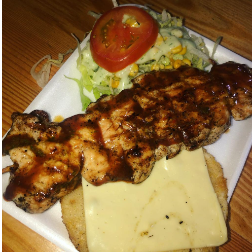 Pan, pollo, queso, tocineta, ensalada, cebolla caramelizada, ripio de papas, salsas.