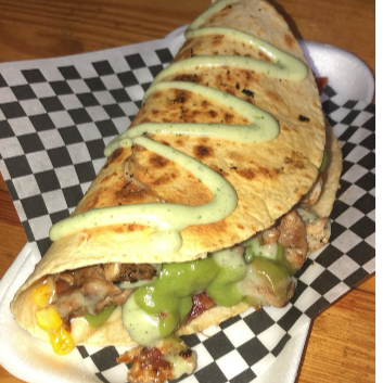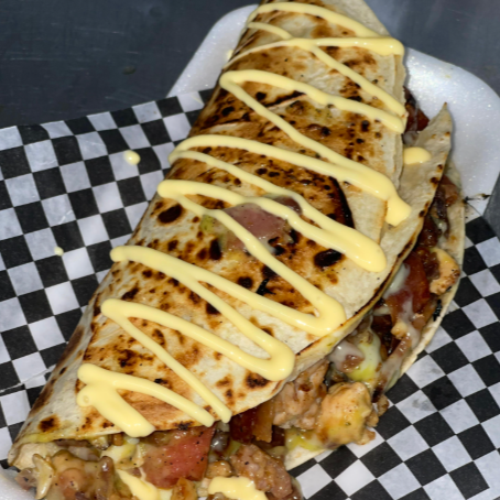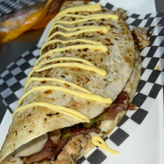 Tortilla, queso, carne, pollo, tocineta, salsas.