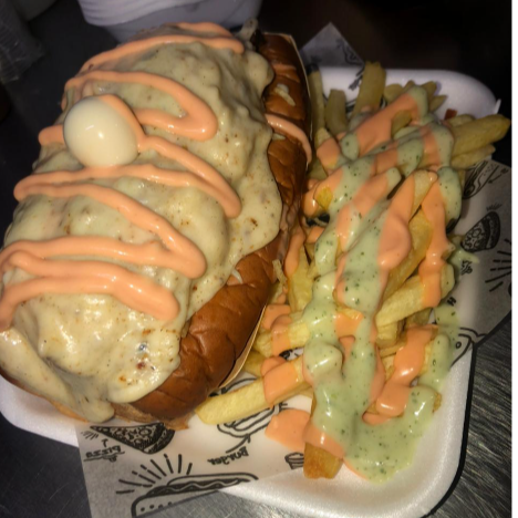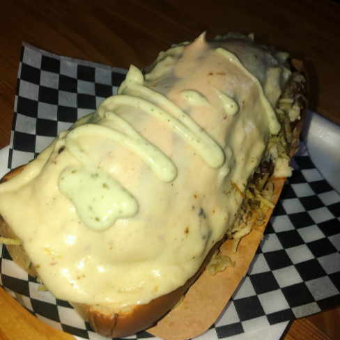 Pan, salchicha, ensalada dulce, queso, ripio de papas, salsas.