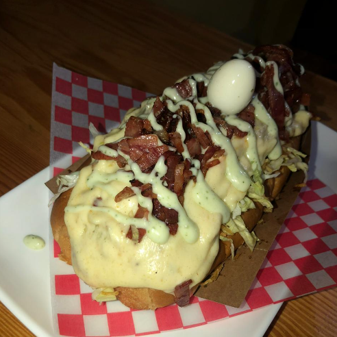 Pan, salchicha, mucha tocineta, ensalada dulce, ripio de papas, queso, más tocineta, huevo de codorniz, salsa.