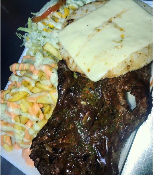 Arepa, carne, queso gratinado, maíz tierno, salsas.