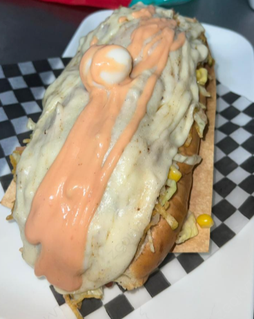 Pan, salchicha ranchera, mucha tocineta, ensalada de lechuga y tomate, ripio de papas, doble queso, huevo de codorniz, salsas.