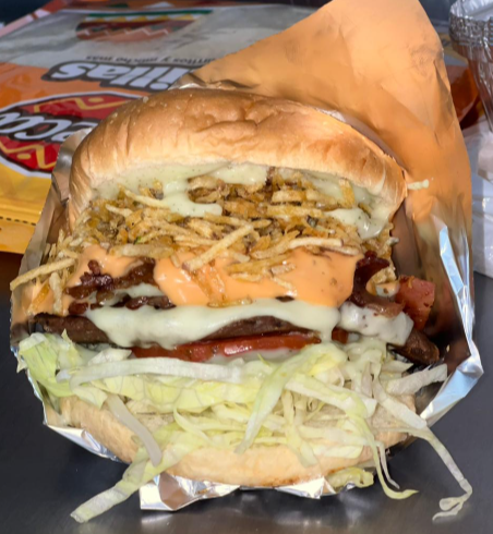 Pan, dos carnes, doble queso, mucha tocineta, lechuga, tomate, cebolla caramelizada, ripio de papas, salsas.