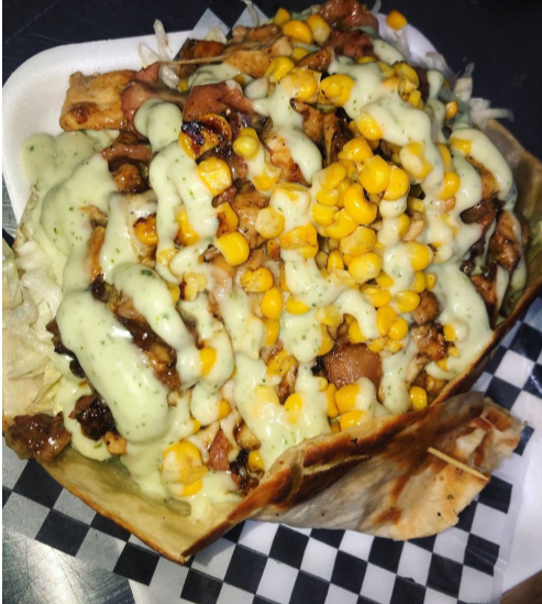 Lechuga, pollo, tocineta, maíz tierno, queso gratinado, ripio de papa, guacamole y otras salsas.