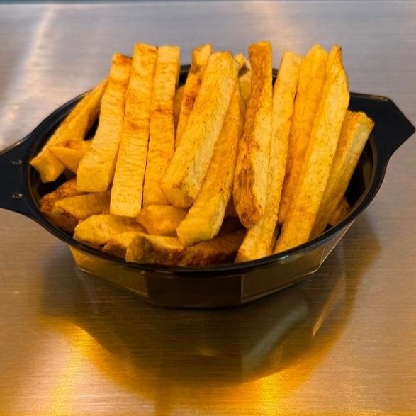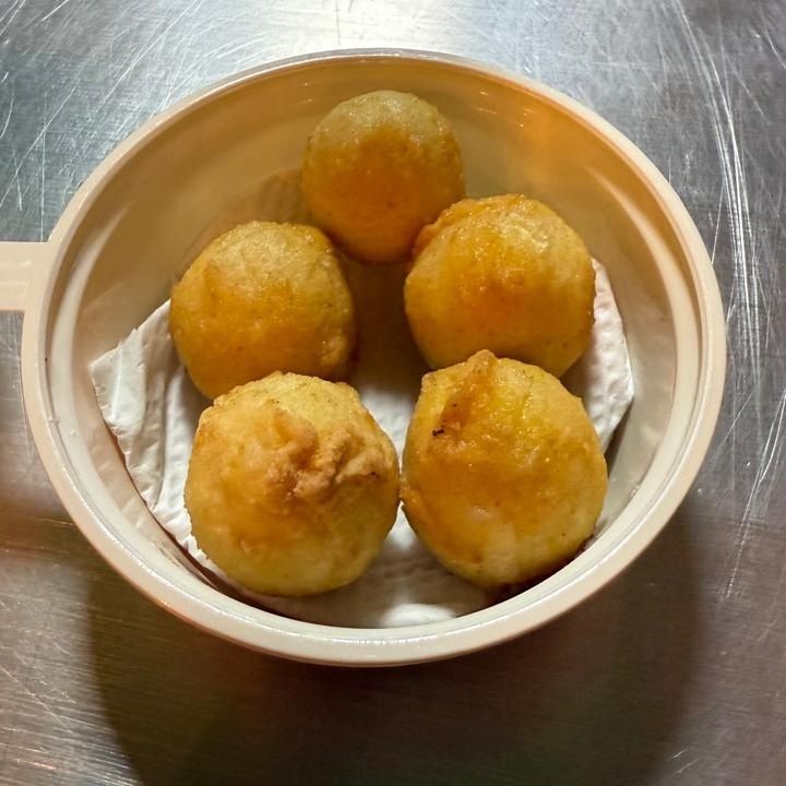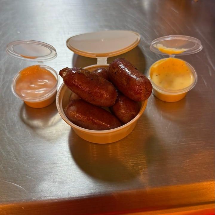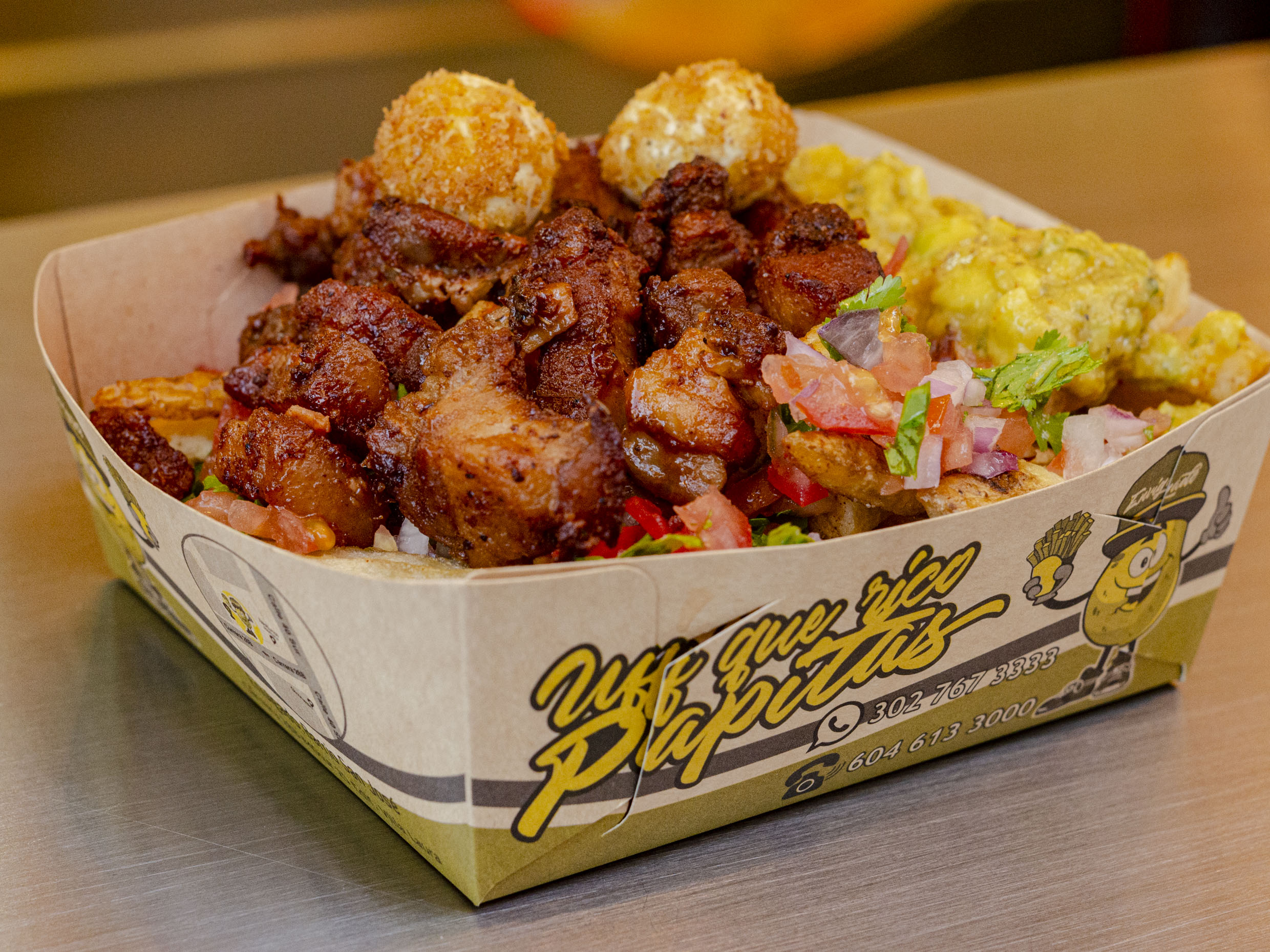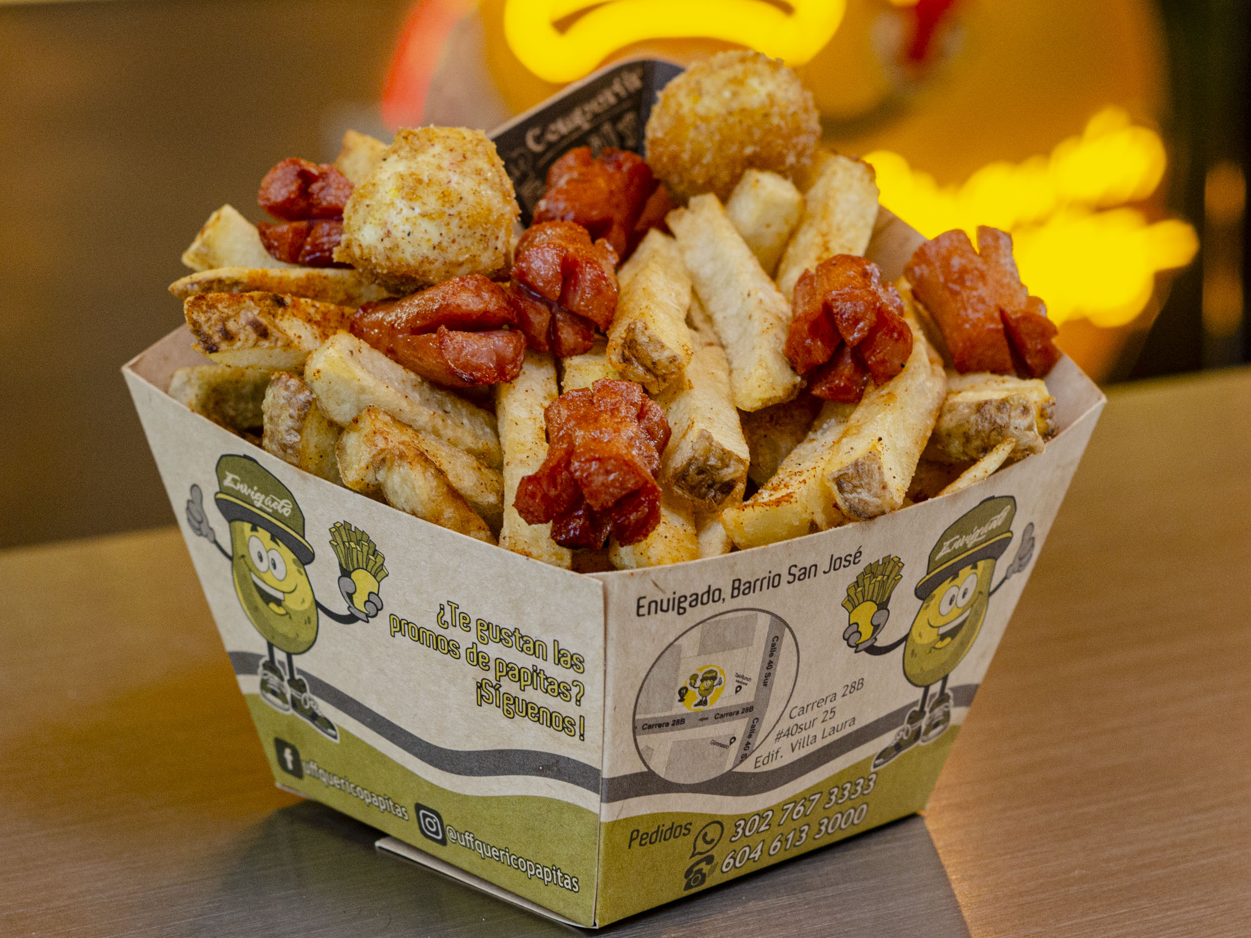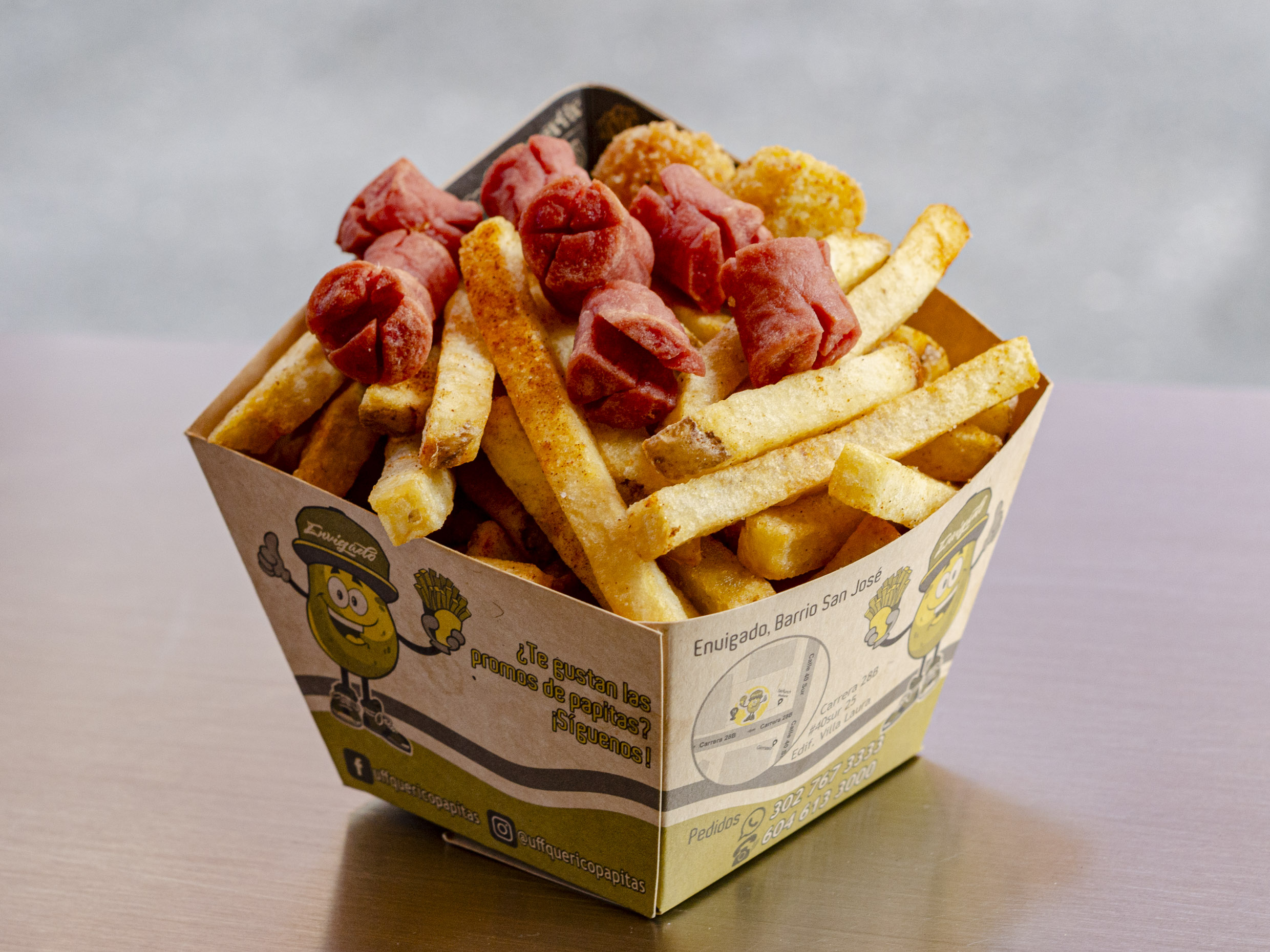 400 g Aproximadamente papa artesanal, 2 huevos de codorniz apanados, salchicha ranchera zenu, queso rayado y salsas artesanales.