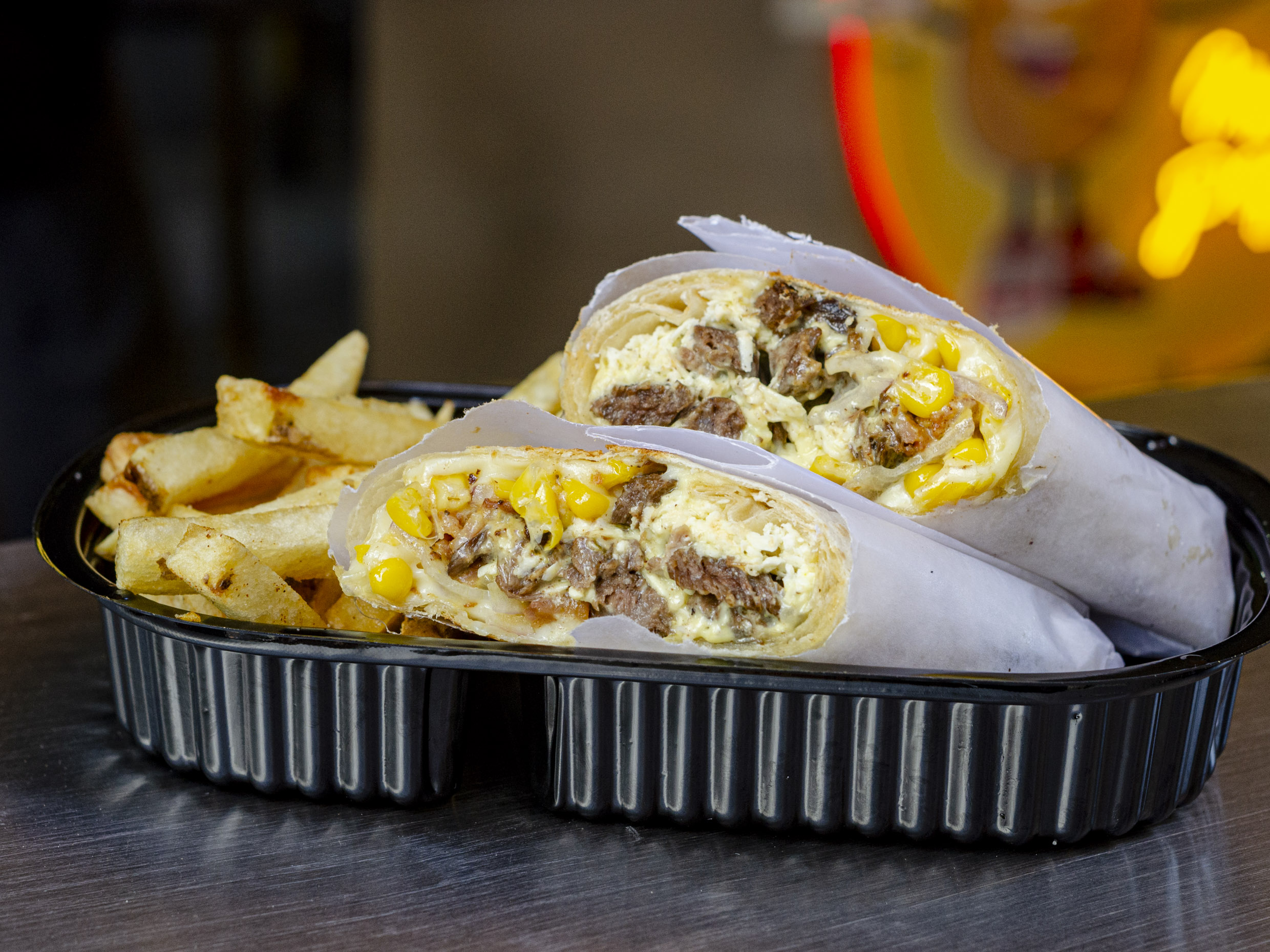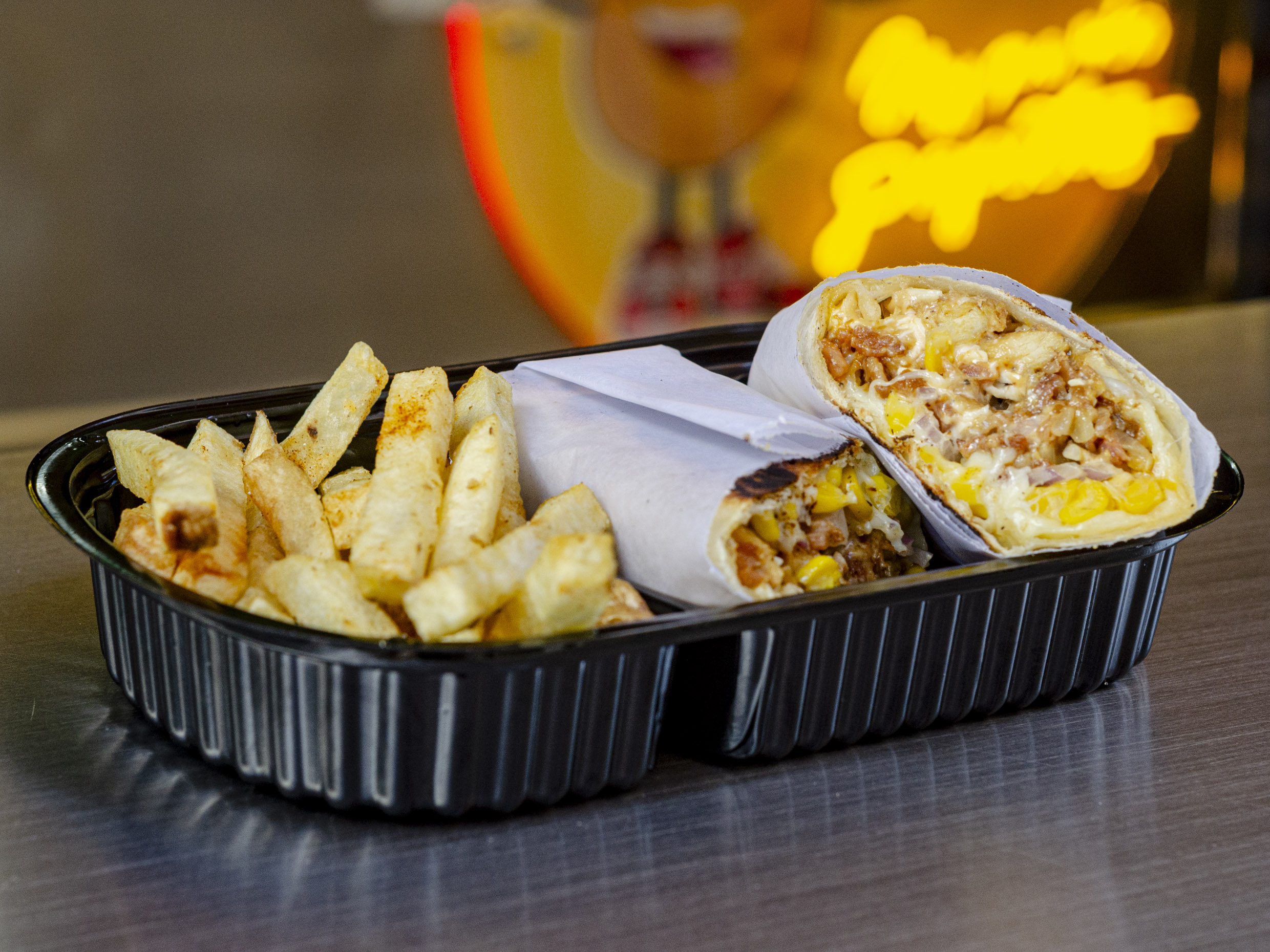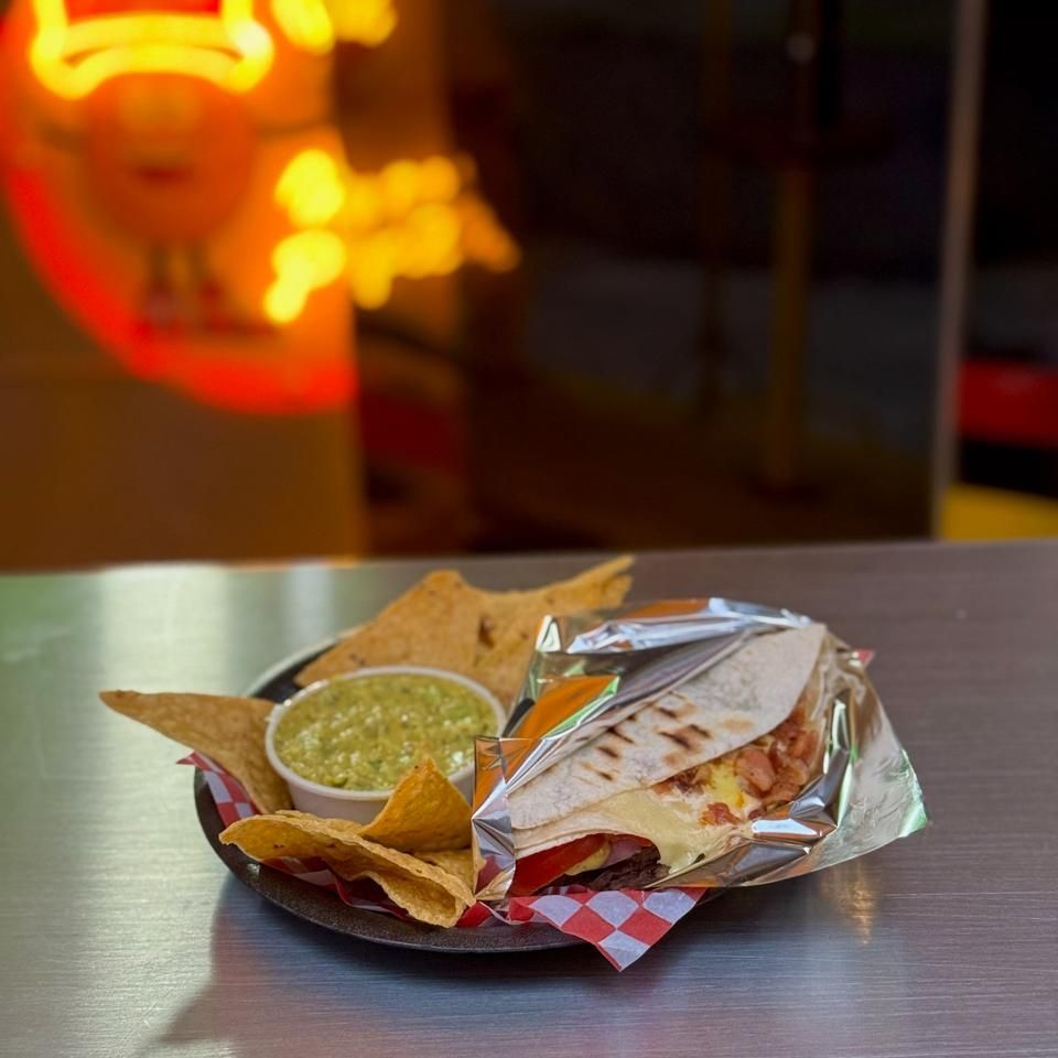 Tortilla de maíz, 100% carne de res en trozos, tocineta, maicitos, queso rayado, queso mozzarella, cebolla, salsas artesanales, salsas tradicionales acompañado de papas artesanales o nachos con guacamole artesanal.