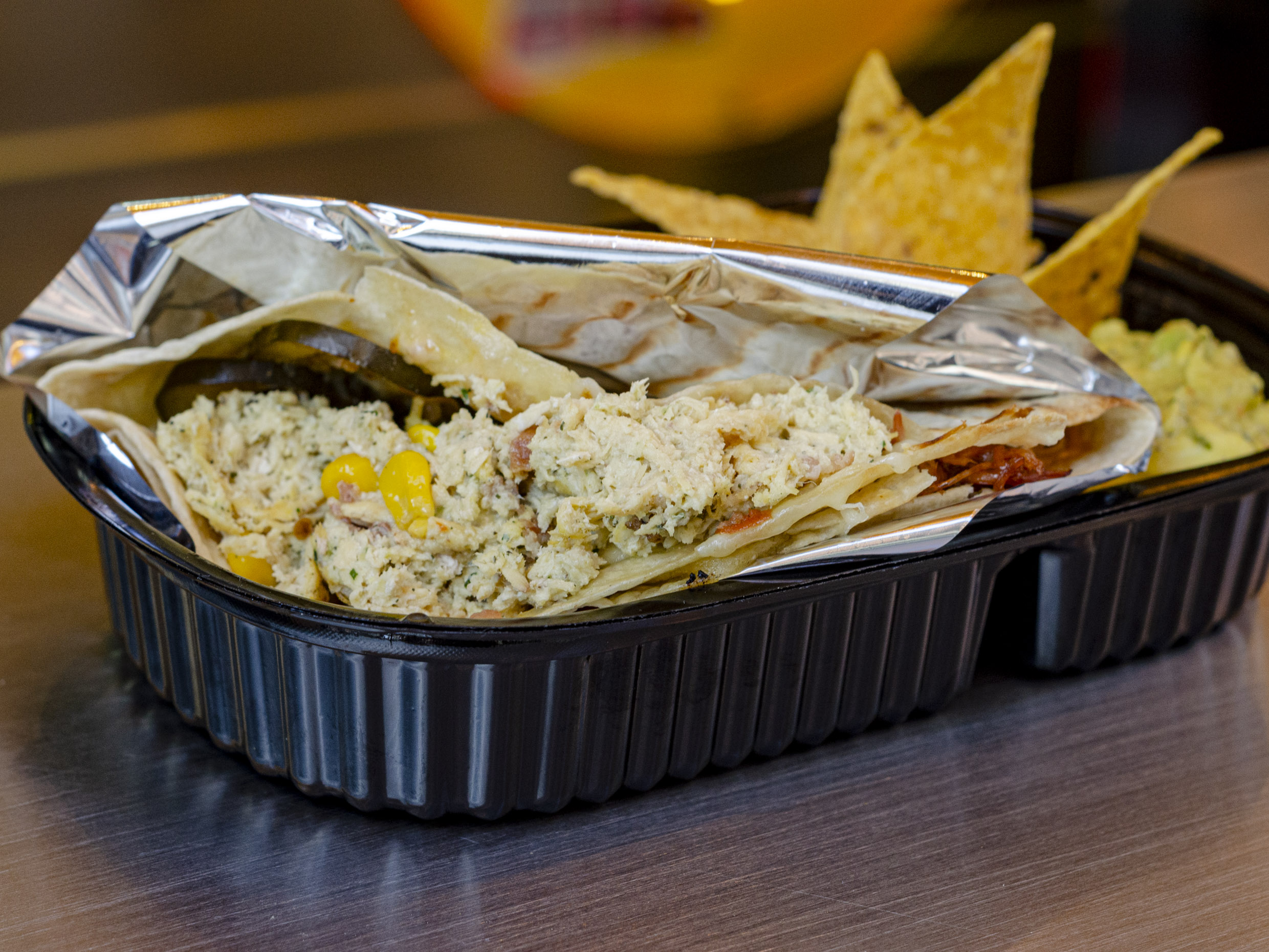 Tortilla de maíz, 100% pollo desmechado en una mezcla con maicitos, tocineta, queso mozzarella, vegetales, pepinillos artesanales, sour cream, queso rayado, guacamole artesanal, salsas artesanales, salsas tradicionales acompañado de papas artesanales o nachos con guacamole artesanal.
