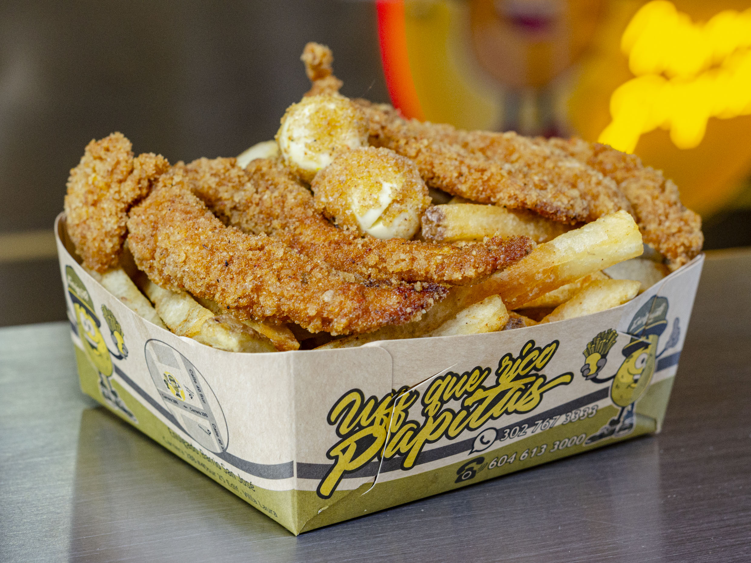 400 g Aproximadamente papa artesanal, 250 g aprox. 5 tiras de 100% pollo apanado, 2 huevos de codorniz apanados, queso rayado más salsas artesanales y tradicionales.