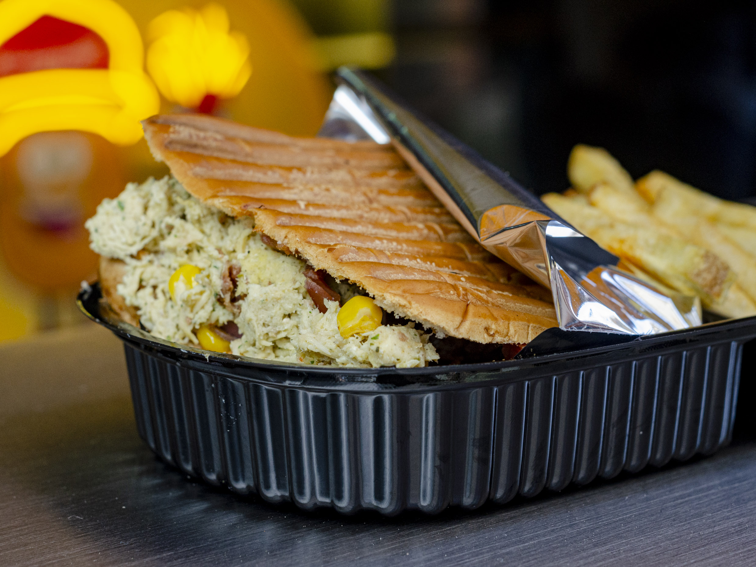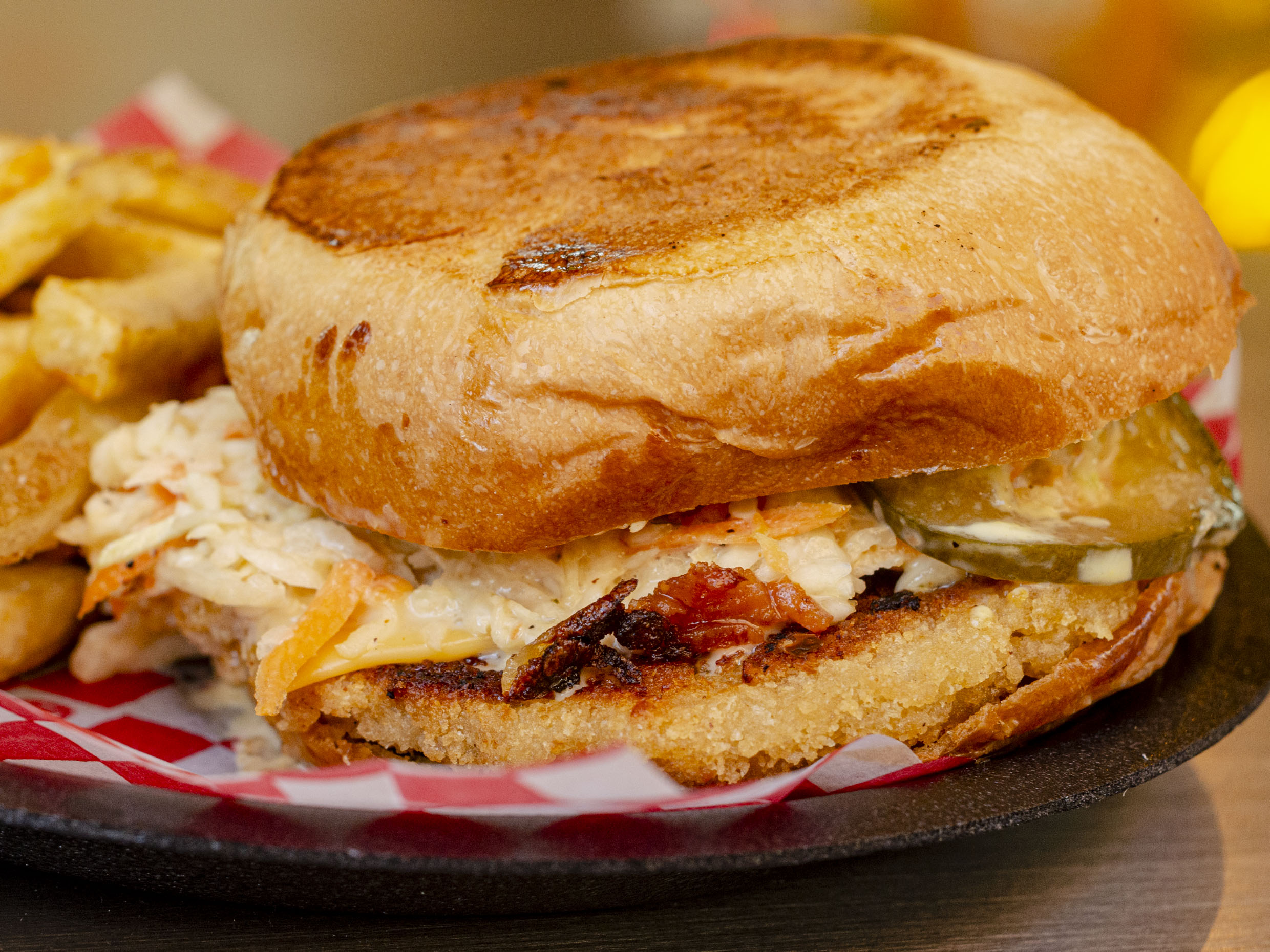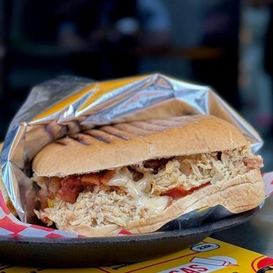 Pan sándwich brioche, 100% pollo desmechado en una mezcla con maicitos, tocineta, queso mozzarella, vegetales, pepinillos artesanales, sour cream, queso rayado, salsas artesanales, salsas tradicionales acompañado de papas artesanales o nachos con guacamole artesanal.